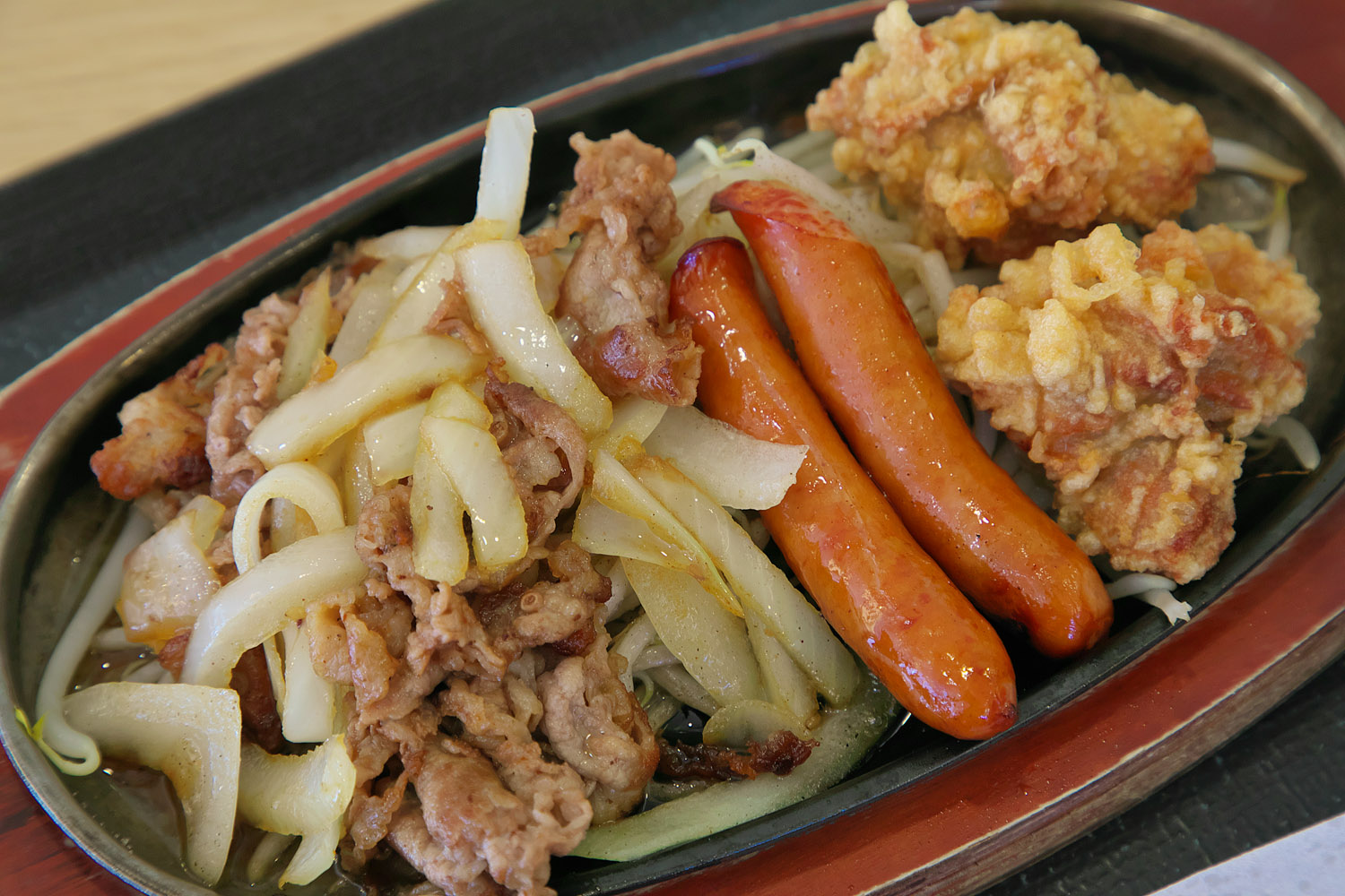 熱々の鉄板の上に甘辛のタレを絡ませた牛バラ肉、ソーセージそして唐揚げというまるでジェットストリームアタックのような攻撃だ。牛肉の美味しさを引き立てるのがシャキシャキのもやしと玉ねぎ。これがタレと絡むので、ご飯が止まらない。