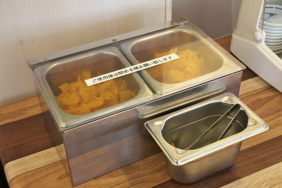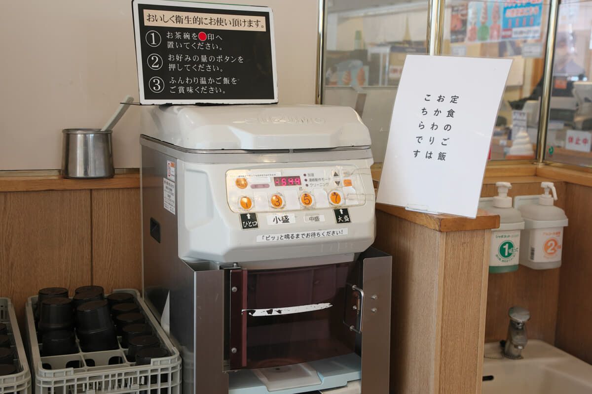 ご飯おかわりができるジャーが、客席に置いてあるのでひと口から大盛りまで4種類から自分の好みの量を選ぶことができる。また、カウンターにはサービスのお漬物が好きなだけ取れるようになっているのも魅力。