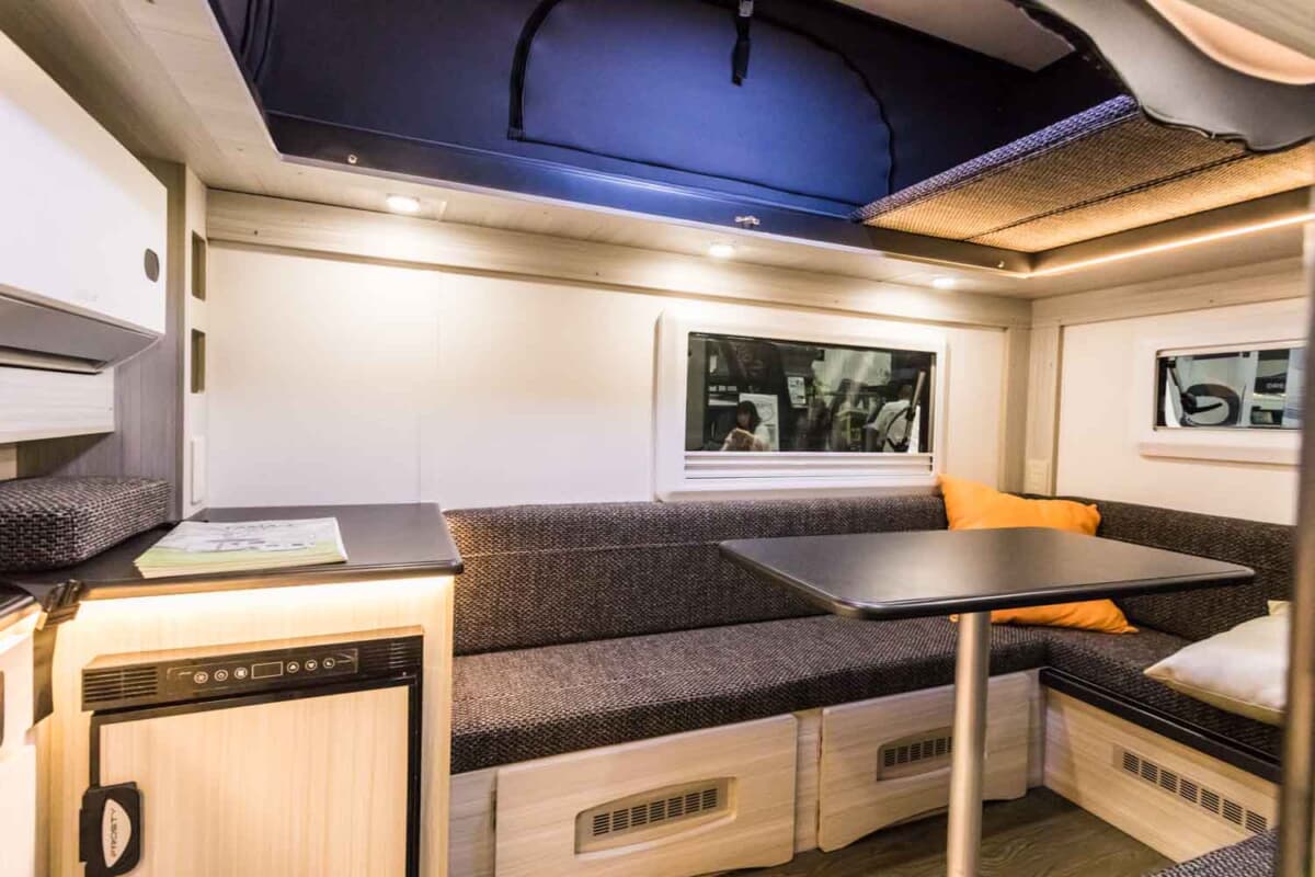 車体の左側面前方にあるドアから中に入ると、前方側にシンクや冷蔵庫、クーラーなどがコンパクトに集約されている。そして残りの部分に関しては、コの字型に配置されたソファと中央のテーブルで構成される大きなダイネットとなっている。ポップアップルーフは、天井のほぼ全面が約50cm嵩上げすることで、室内は天井高が2m近く確保され、立って移動することができるのだ。