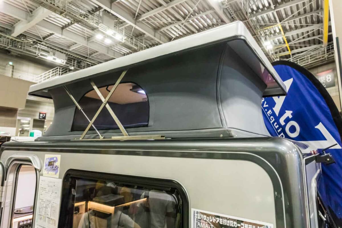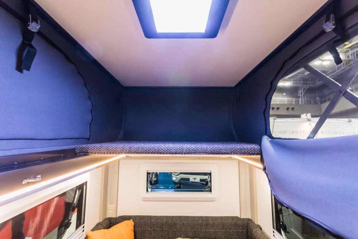 ちなみにダイネット部分はそのままベッドになり、142cm×185cmというダブルサイズの就寝スペースとなる。これで大人2名が就寝可能だ。さらにポップアップ部分がルーフベッドとなるため、上部にも97cm×186cmのスペースを確保。そのため、これほどコンパクトな車体にもかかわらず、大人3名分、もしくは小さな子供2名と大人2名のファミリーでも使える就寝スペースを実現している。