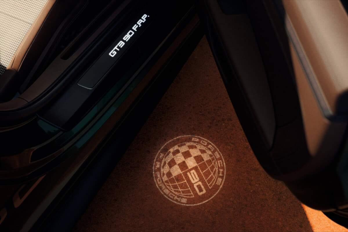 足もとには通常の911 GT3ツーリングパッケージには設定されない、サテングロスブラック塗装のスポーツクラシックホイールを装備。クラシックなフックスホイールの意匠を現代的にリメイク。センターロック機構や1963年の歴史的クレストを配したホイールハブカバーなど、細部にまで特別仕様が施されている。トランクリッドのグリルには、「90 F. A. Porsche」の文字を刻んだ亜鉛メッキゴールドのバッジが取り付けられ、記念モデルであることを主張する。