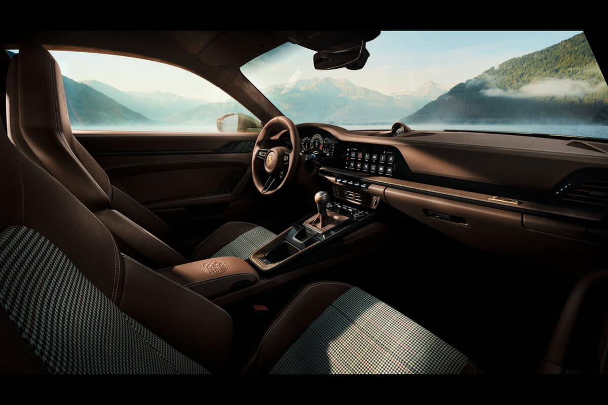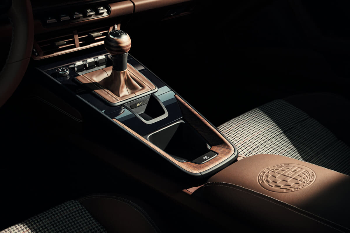 インテリアはトリュフブラウンのクラブレザーを基調に、チョークベージュの装飾ステッチを組み合わせた上質な空間。シートセンターパネルには、F. A.ポルシェが愛用していたジャケットの柄に着想した特製のF.A.グリッド織りファブリックを採用。この生地はブラック、グリーン、トリュフブラウン、クリーム、ボルドーレッドの5色の糸で織られ、グローブボックスやラゲッジルームのリバーシブルマットにも起用されている。さらに、オープンポア仕上げのウォールナット合板で作られたシフトノブにはF. A.ポルシェのサインが刻まれ、ダッシュボードには「One of 90」の文字を含むゴールドメッキプレートが装着される。
