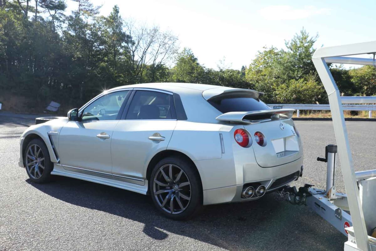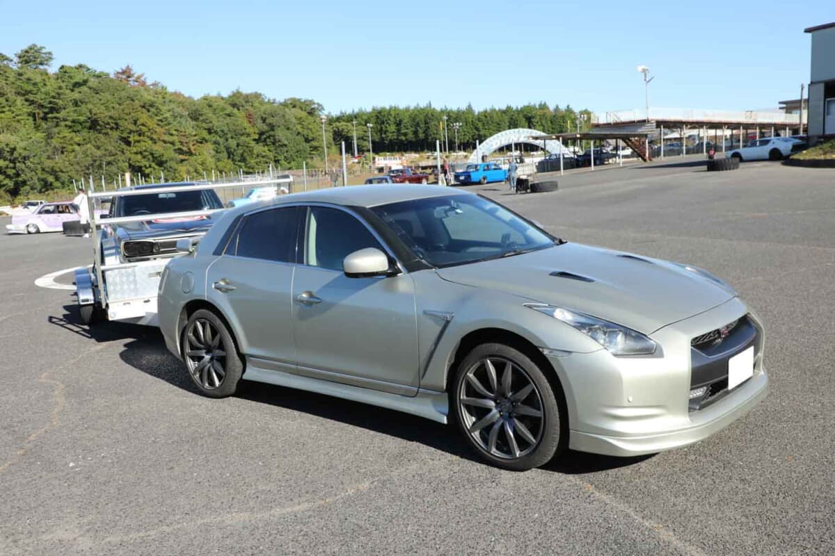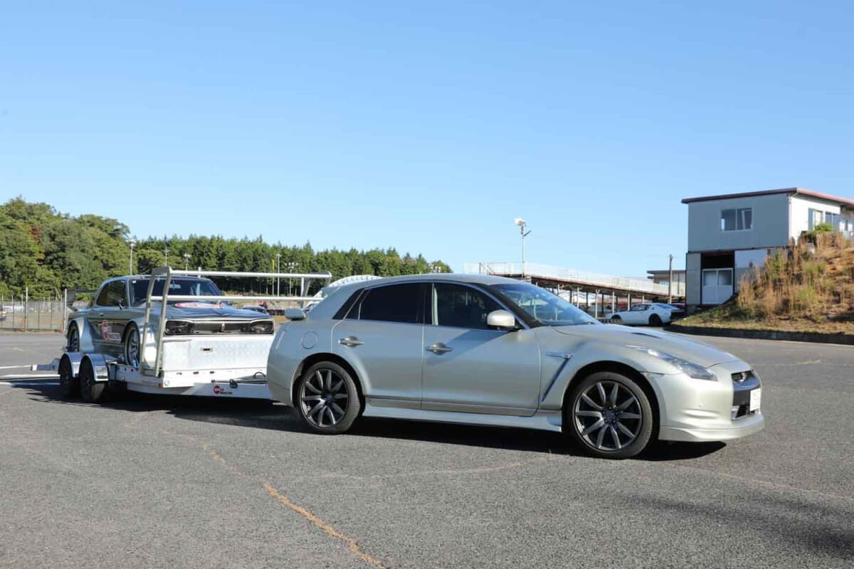 「こんな手があったのか」と感心させられるでき栄えの、自作「R35 GT-Rクロスオーバー」。その完成度が素晴らしい。この鋭い発想を思いつき、実行したのが岐阜県在住の林憲一さんだ。昔からドリフトが大好きで、その腕前もプロ級。愛車はフルチューンのSR20DETを搭載したハコスカで、「スカイラインはスカイラインで運びたい」と考え、専用トレーラーとパワーも十分な4輪駆動のスカイラインクロスオーバーを購入した。その際にふと思い立ったことがある。