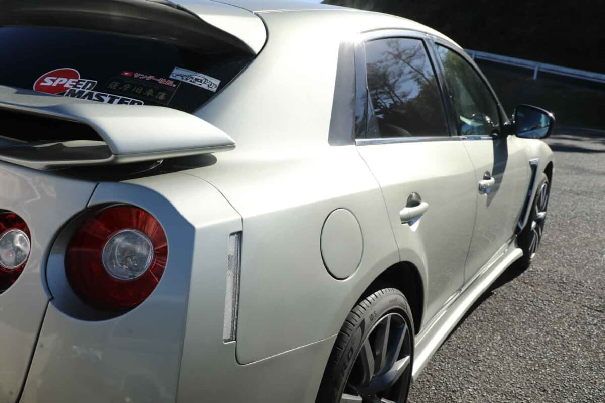 また、R35 GT-Rの象徴であるウイングも装着。ルーフラインとのバランスを考慮し、純正ルーフスポイラーをGT-Rウイングに似せたデザインにしているのもポイントだ。バンパーやマフラー(テールのみ)も純正部品を移植し、ホイールを含めた仕上がりは完璧。この大掛かりな作業をわずか2カ月でやり遂げたというから驚きだ。情熱と飽くなき挑戦が生み出した、傑作と呼べるプライベートマシンである。