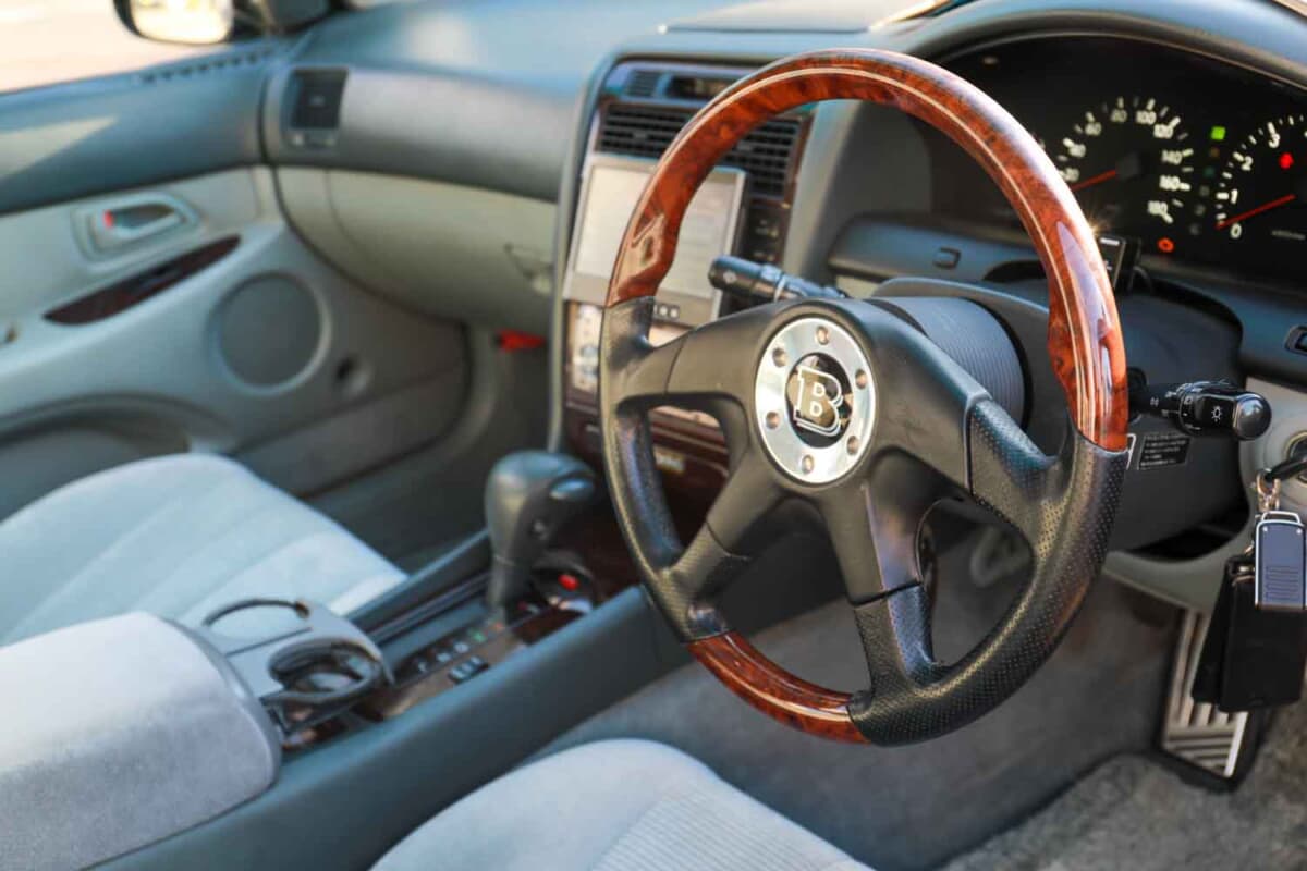 「足まわりを変えてナンバーフレームを装着しているので、カスタム感が強いかもしれませんが、じつは外装や内装は純正品を多用しています。僕の車両は前期型ですが、リヤバンパーは北米レクサスGS300と同じ、全長が長い後期型に変更しました。内装も、前期型では設定がなかった後期用のドリンクホルダー付きセンターコンソールに変えたり、純正の木目パネル、サンルーフ、空気清浄機、ごみ箱も備えています」