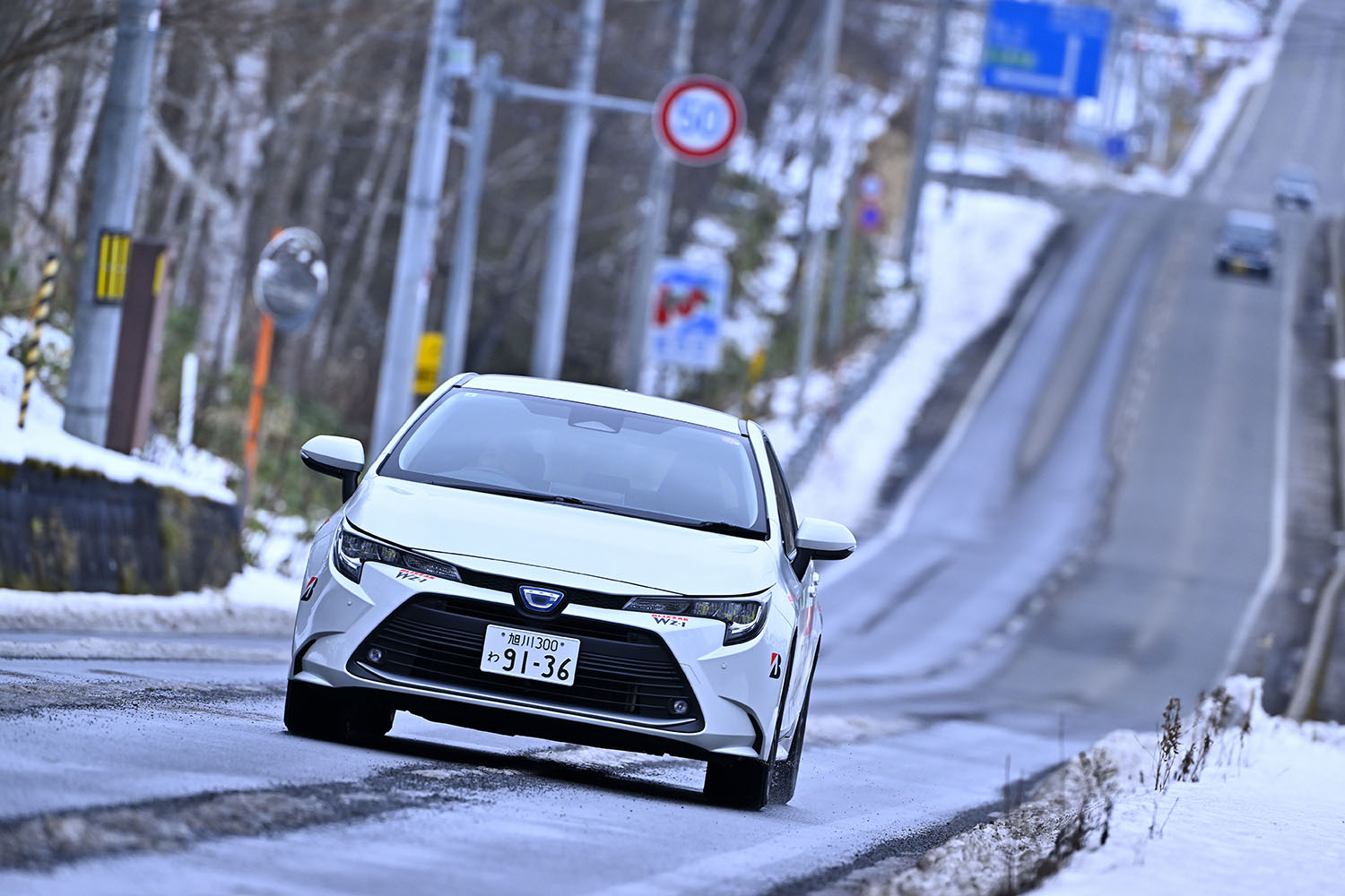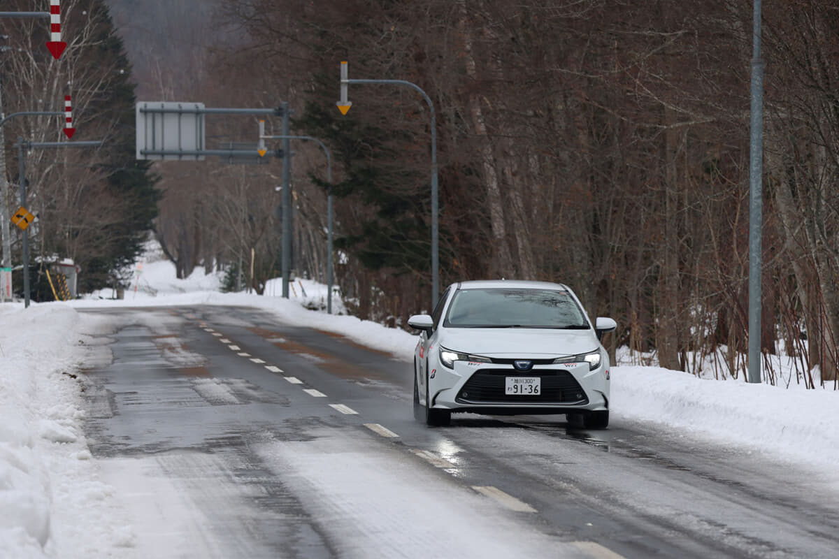 旭川市内は前日夜まで路面に積雪はない状態だったが、深夜から降り始めた雪によって路面は薄く雪が乗っているような状況になっていた。午前9時にスタートする際の外気温は0℃ながら日差しがほぼない曇り空で、雪とその下に薄く残る氷面が溶けるか溶けないかといった状態で見た目以上に滑りやすい路面状況だった。