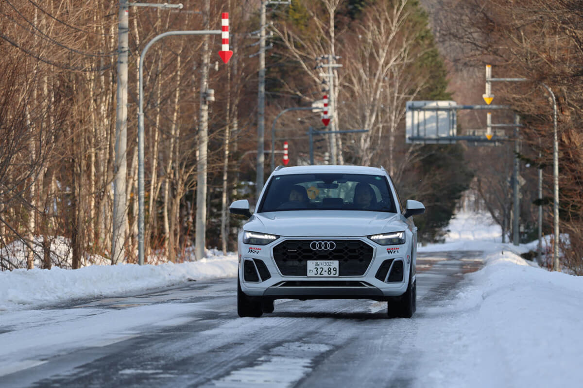 試乗の概要は、旭川市街から大雪山連峰にある旭岳温泉に向かい、旭岳温泉のホテルと旭岳のふもとにある駐車場で、交互に車両を乗り換えることで、国産車6車種、輸入車2車種の計8車種、タイヤサイズではホンダN-BOXに装着の14インチから、トヨタ・クラウンクロスオーバー、アウディQ5に装着の19インチまでの1インチ刻みで、扁平率も65から55までの3種を確かめられるという、1日の試乗メニューとしてかなり充実していた。ちなみに試乗車すべが4WDで、それぞれの4WDシステムや重量配分などによる特性を改めて知ることができ興味深かったが、そこは今回は触れないでおく。