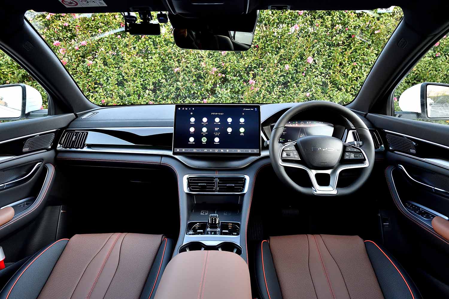 クリスタルを思わせる短い透明なシフトレバーをDレンジに操作して、BYDらしい静かで滑らかな動き出しに思わずニンマリする。アクセルを踏んでも過度な飛び出し加速を抑えた自然な加速フィールのおとなの制御は、ハイブリッドのシーライオン6にそのまま生きている。駆動用バッテリー容量は18.3kWhあり、前輪をモーターだけで駆動すると航続距離は100kmにもなる。これでは2時間の試乗時間でエンジンによるハイブリッド車感覚が味わえずに終わる可能性大。なのでバッテリーの充電率、残容量を表すSOC=ステート of チャージの残容量を25%と低く設定して、エンジンを意図的に始動。EV走行だけじゃないエンジンによるハイブリッド走行フィールを得られるようにした。
