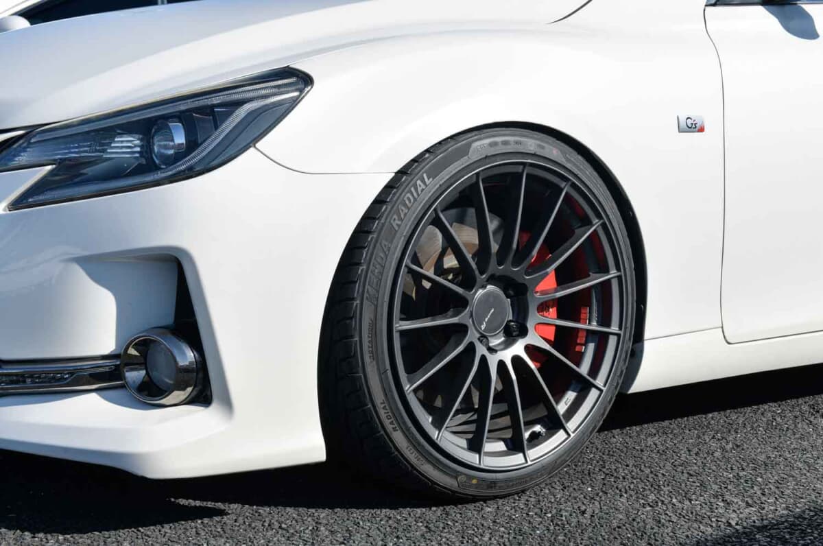 「このG’sならではの顔がカッコいいですよね! 基本的にはこの純正の雰囲気が好きなので、今後も大胆に変えることはないと思います。マークXに乗っているユーザーさんでカッコいいカスタムをしていた方に憧れていたので、許可をいただいてホイールは同じエンケイのRS05RRに変更して、車高調はブリッツを使っています。今はリアスポイラーも注文しているので、それが届くのが楽しみです」