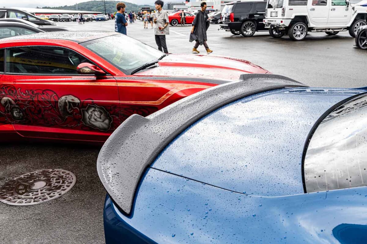 「マフラーを換えたりホイールを入れたり、エアサスは去年入れました。ホイールはクラスリートで、リアが12J、フロントが10Jです。エアサスにしたのは、やっぱりショーカーとしてイベントに出たいというのもありましたね。ただちょっと柔らかい部分もあるので、車高調も入れて調整できるようにして、キャンバーも走りのためにあまり寝かさないように立ち気味にしています。あとマフラーは中間から、コルサというブランドのものを入れています。エアロはアンダーソンというフルカーボンのやつなんです。去年セマ・ショーに連れて行ってもらったときに、このアンダーソンを見て『これを付けたい』となってフルエアロを装着しました」