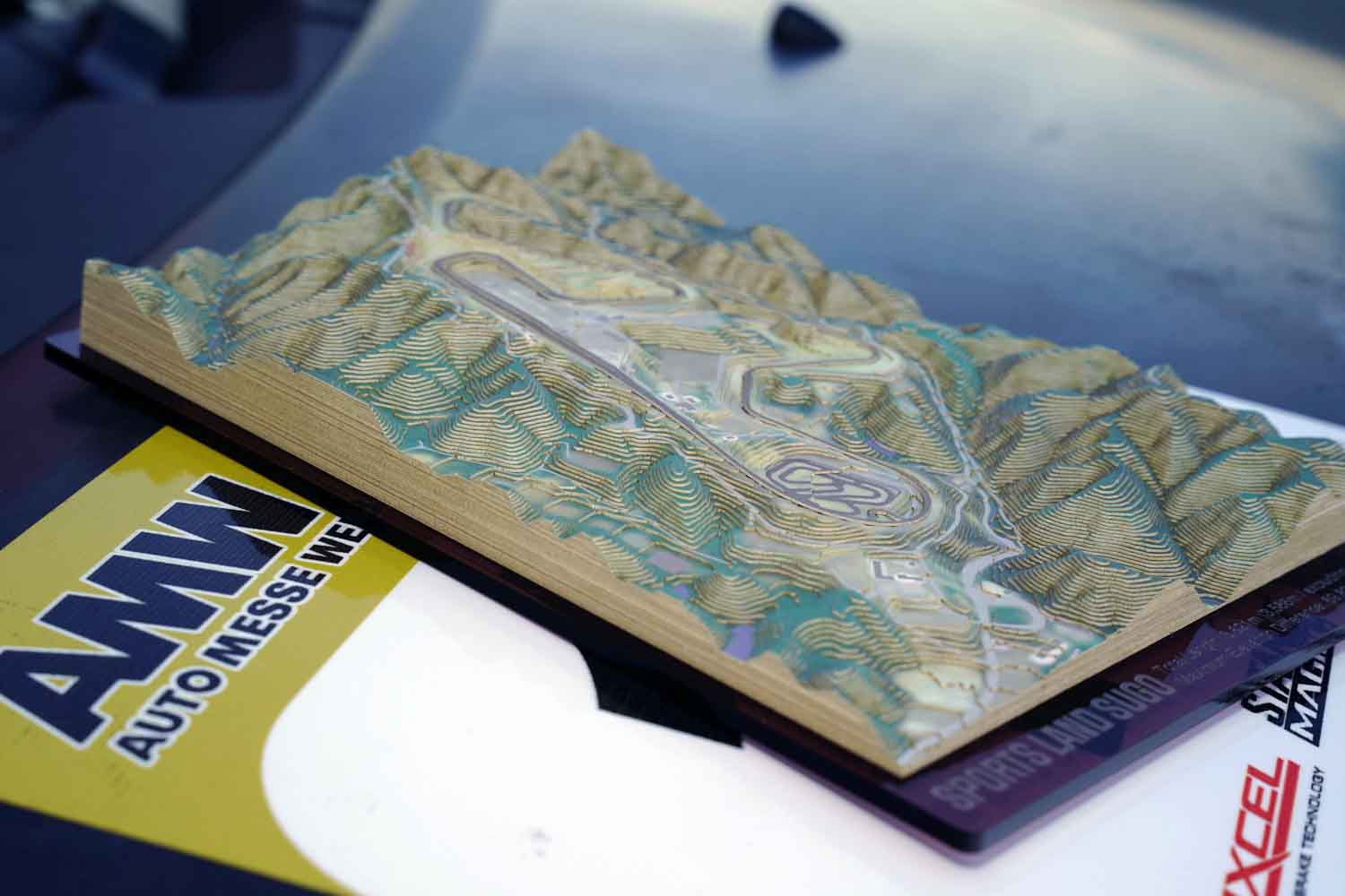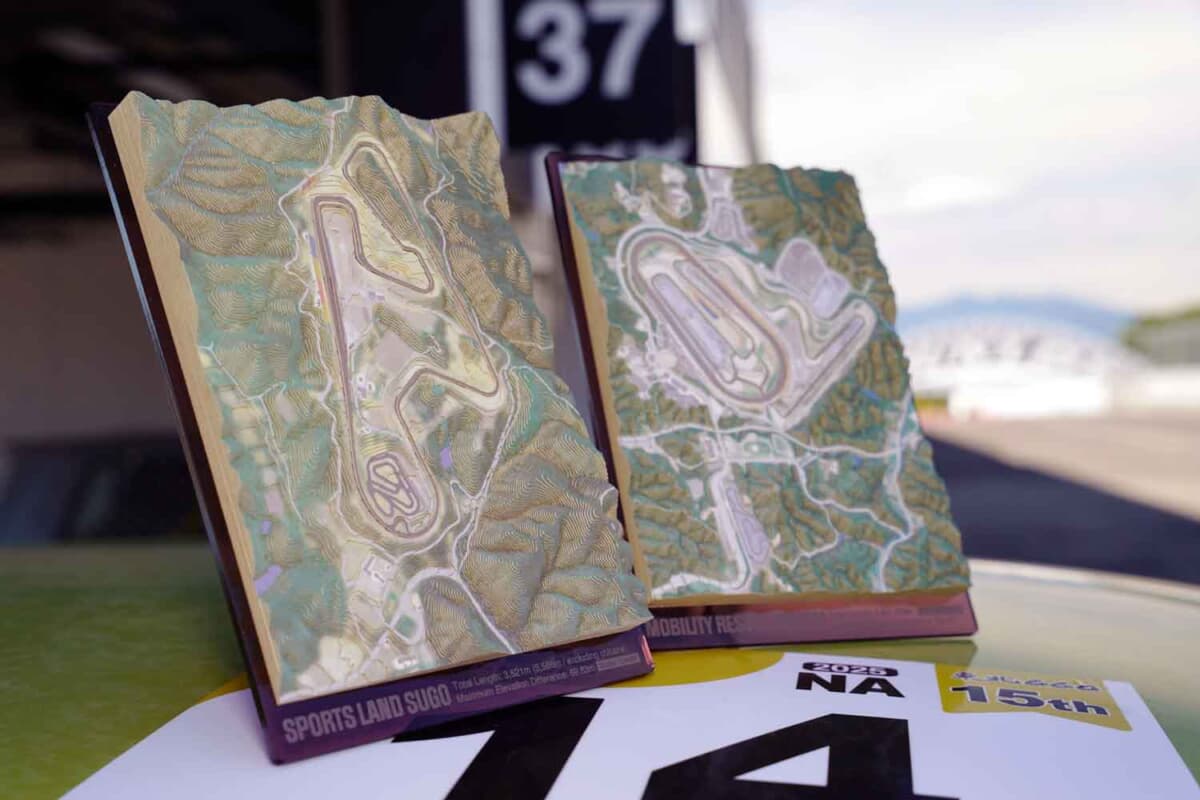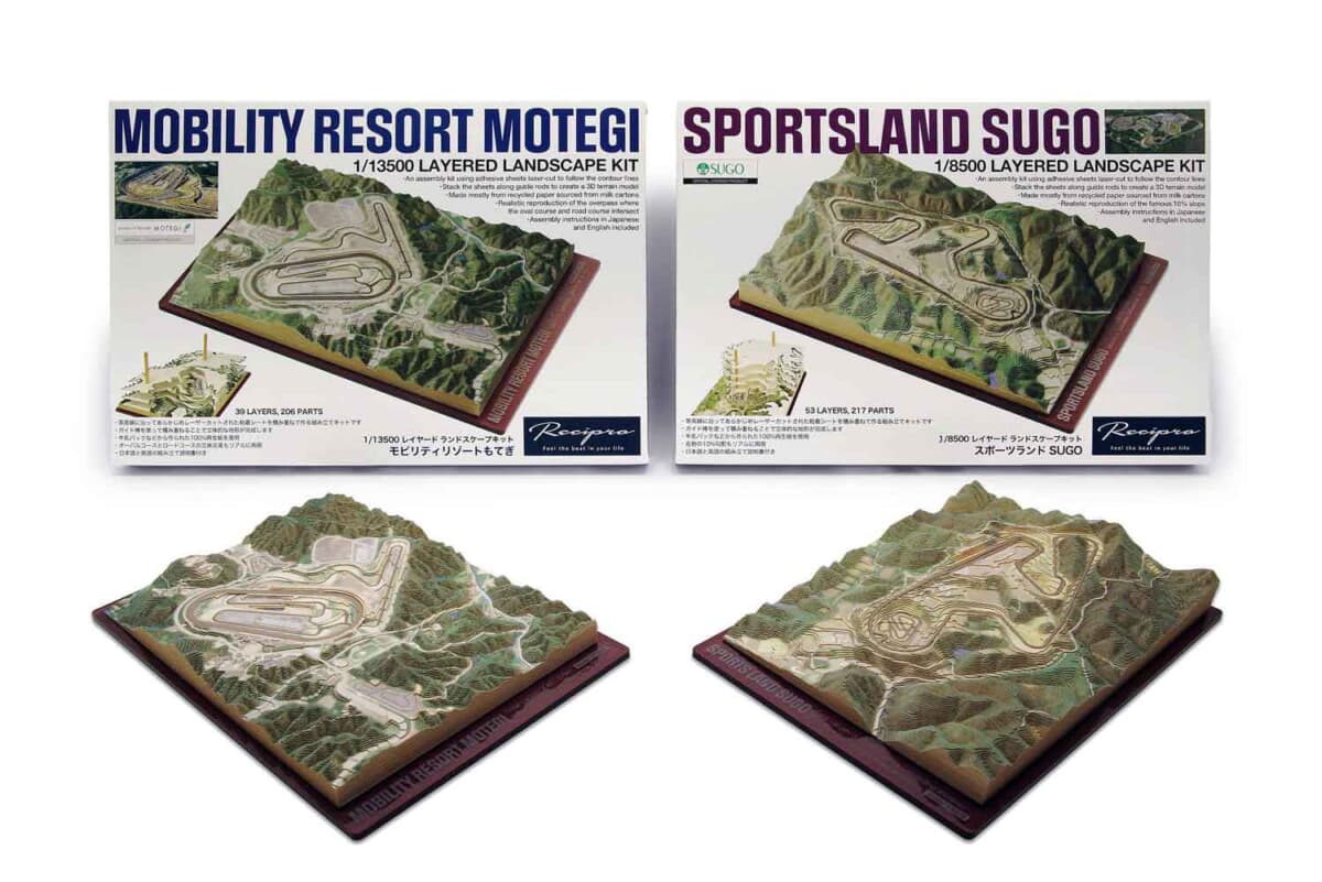 スポーツランドSUGOの「レイヤード・ランドスケープキット」は、SUGOのオフィシャルショップでの購入をおすすめする。ちなみにSUGOで販売している分に関しては、創業50周年の記念シールが貼ってあるという。今後はほかのサーキットにもラインアップを拡大する予定なので、ホームコースの立体地形図を待ち望む人は期待してほしい。自分で走ったり観戦に行ったりするサーキットのミニチュアを、自宅やオフィスのインテリアにすれば、モータースポーツをより身近に感じられることは確実だ。