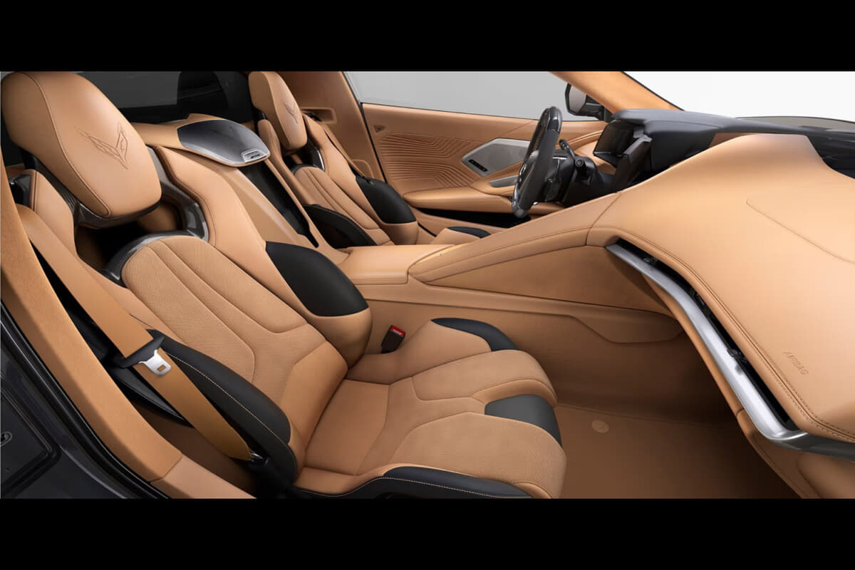 操作系ではセンターコンソール形状と各種ボタンのドライバー寄りのレイアウトの変更で、運転中の操作性が向上。ワイヤレスチャージングトレイは空調スイッチ下の視認性の高い位置に移設され、走行中のスマートフォンの落下や置き忘れを防止。カップホルダーにはアンビエントライトを施し、底部にはコルベットの象徴であるクロスフラッグロゴが刻印されている。