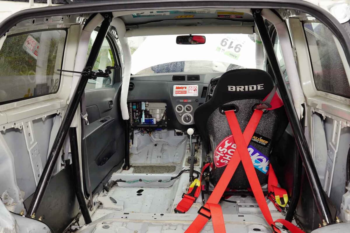 まずは2025年の第3戦から1クラスへステップアップした茂木。チューニングやセッティングはまだ試行錯誤中と話すが、最大のポイントはECUがノーマルのままであることだろう。厳密にいえばAT用で書き換えはしておらず、パワーはライバルたちより明らかに不利で、当然ながらレブリミットも変更していない。ギヤ比は、ベテラン勢がコースごとに特化させて走るサーキットに合わせて組み替えているのに対し、どこでも無難に走行できるオールマイティな仕様。理由は説明するまでもなくコストの問題だ。