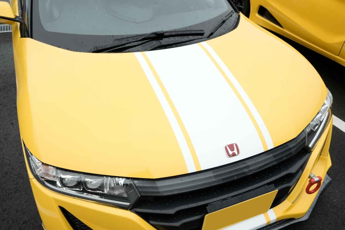 • ホンダ S660:カーニバルイエローのボディにセンターストライプと赤バッジを装着し、レーシーな印象となっている