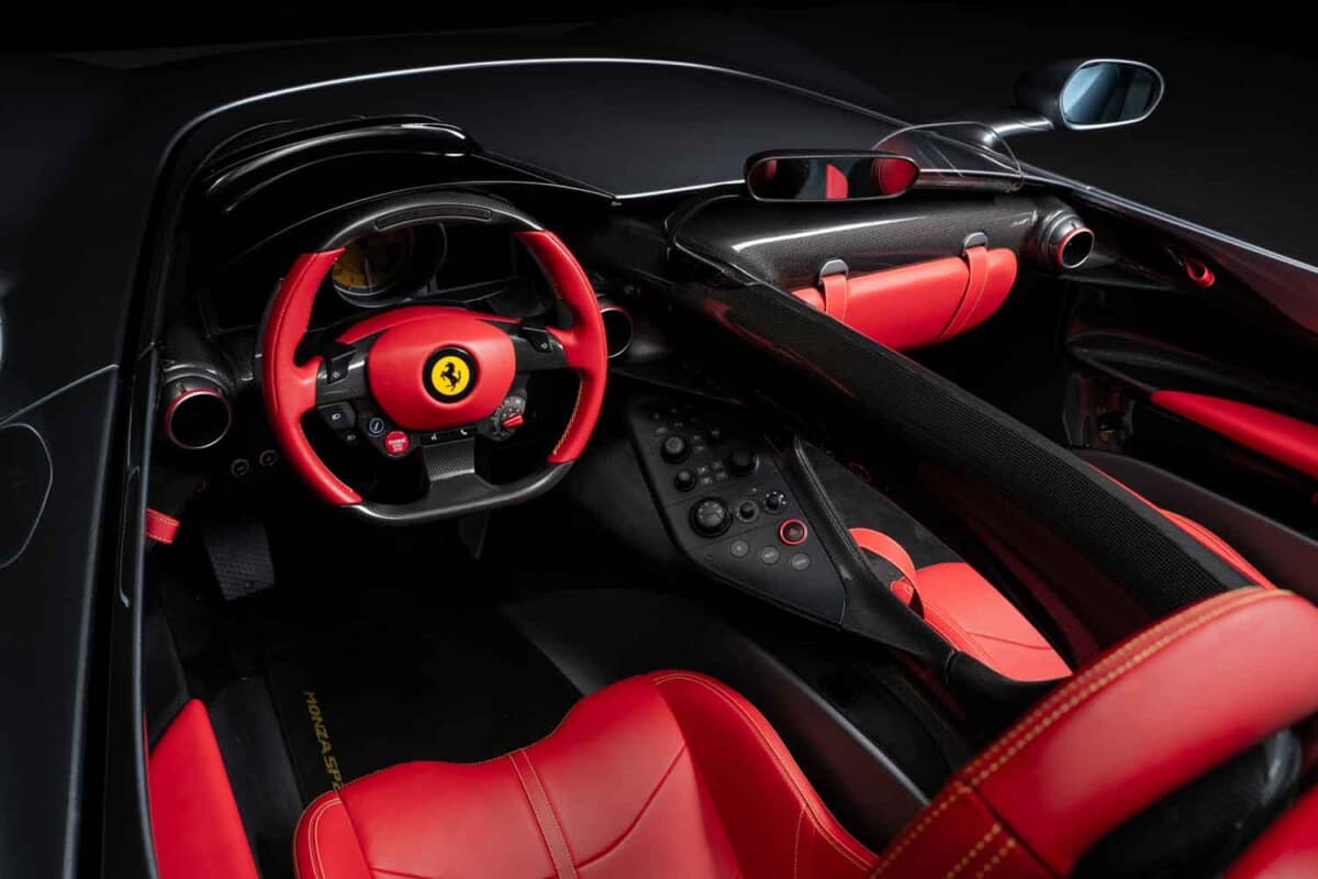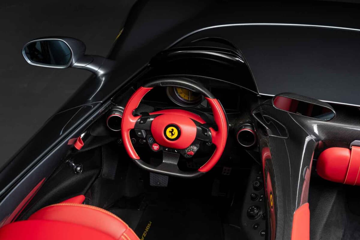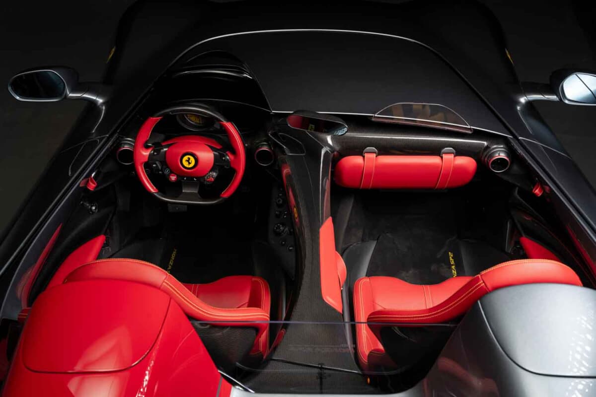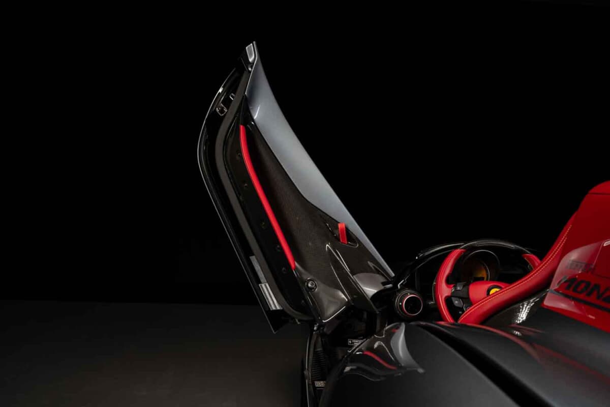 参考までに当時フェラーリから発表されたドライウェイトは、SP1が1500kg、SP2は1520kgという数字。このボディに包み込まれるメカニズムは当時の12気筒ベルリネッタ(クーペ)、812スーパーファストのそれがベースとなっており、フロントに搭載される6496ccのV型12気筒エンジンは、さらに10psが強化され、810psの最高出力を誇った。これに7速ミッションを組み合わせ、0→100km/h加速では2.9秒、0→200km/h加速は7.9秒、そして300km/h以上の最高速を実現するというのがフェラーリからの発表値だった。