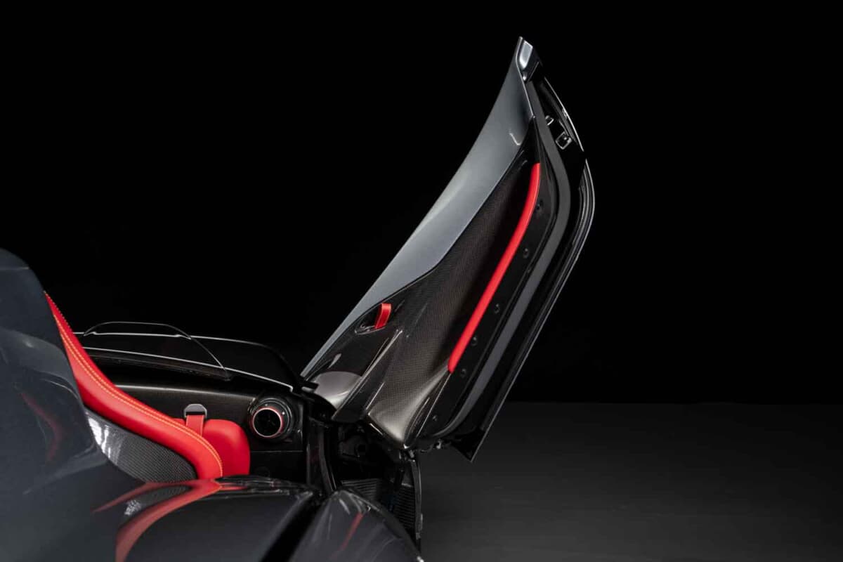 「モンツァSP1」と「モンツァSP2」に与えられた、ウインドウスクリーンやルーフも持たないボディは、軽量なカーボンファイバー素材によって製作されたもので、その基本的なスタイリングはお互いに共通している。しかし、前者はキャビンの助手席側がトノカバーで覆われているシングルシーターとして、そして後者はドライバーとともにパッセンジャーもその走りの楽しさを体験できる2シーターとしてデザインされているところに大きな違いがある。