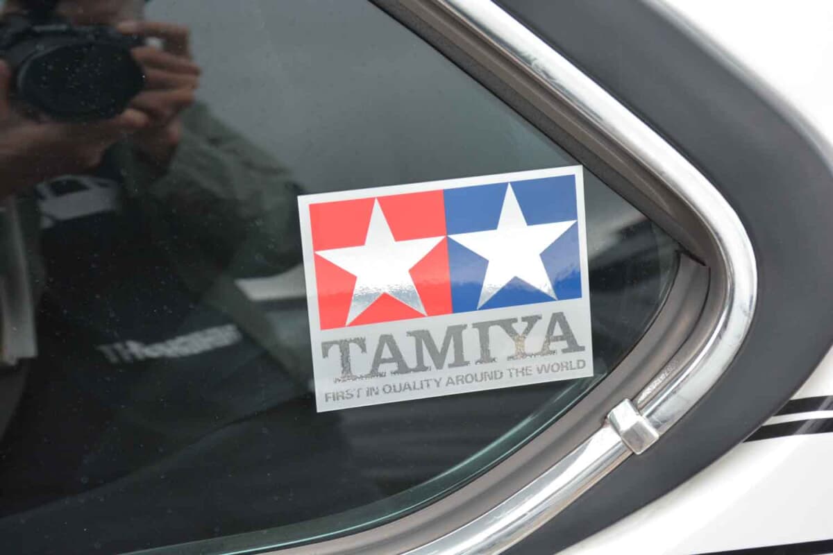 車内にはそのプラモデルの箱が置かれ、サイドウインドウにはお馴染みのタミヤステッカーも貼られているという遊び心。さらに驚いたのは、その仕上げの手法だ。
