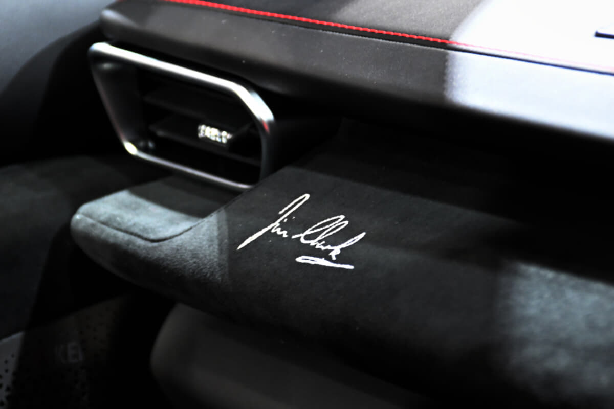 内装は運転席のみレッドとし、ウッドのシフトノブを採用。ダッシュボードには彼のサインが刺繍され、内外装各所には記念バッジも備わっています。
