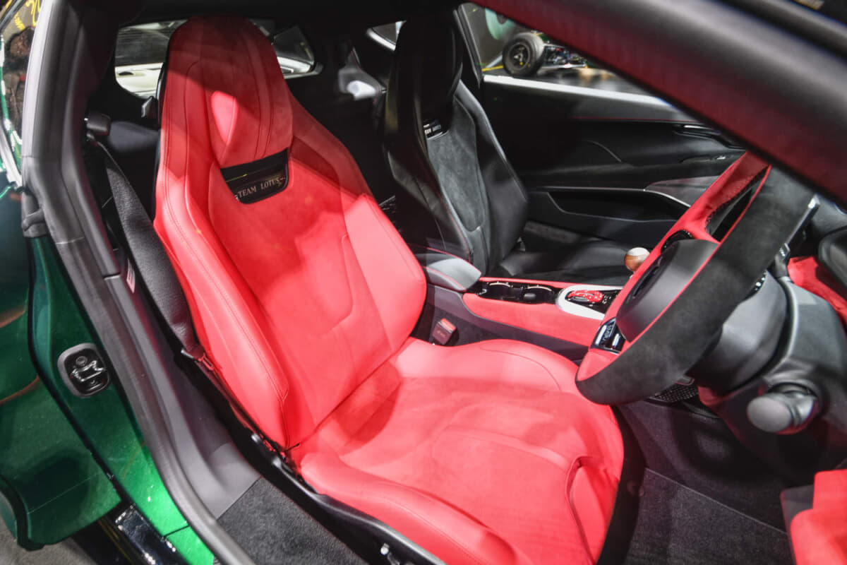 • ロータス エミーラ:運転席はレッド・レザー&アルカンタラの組み合わせとなるが、助手席はブラック・レザーとアルカンタラとなる