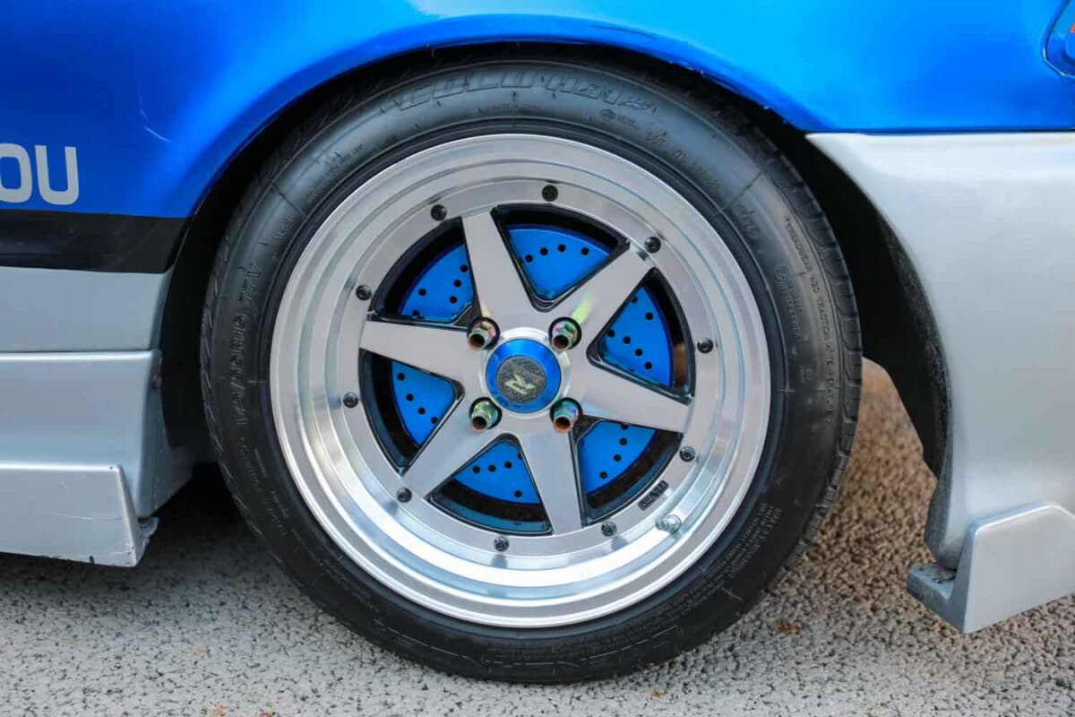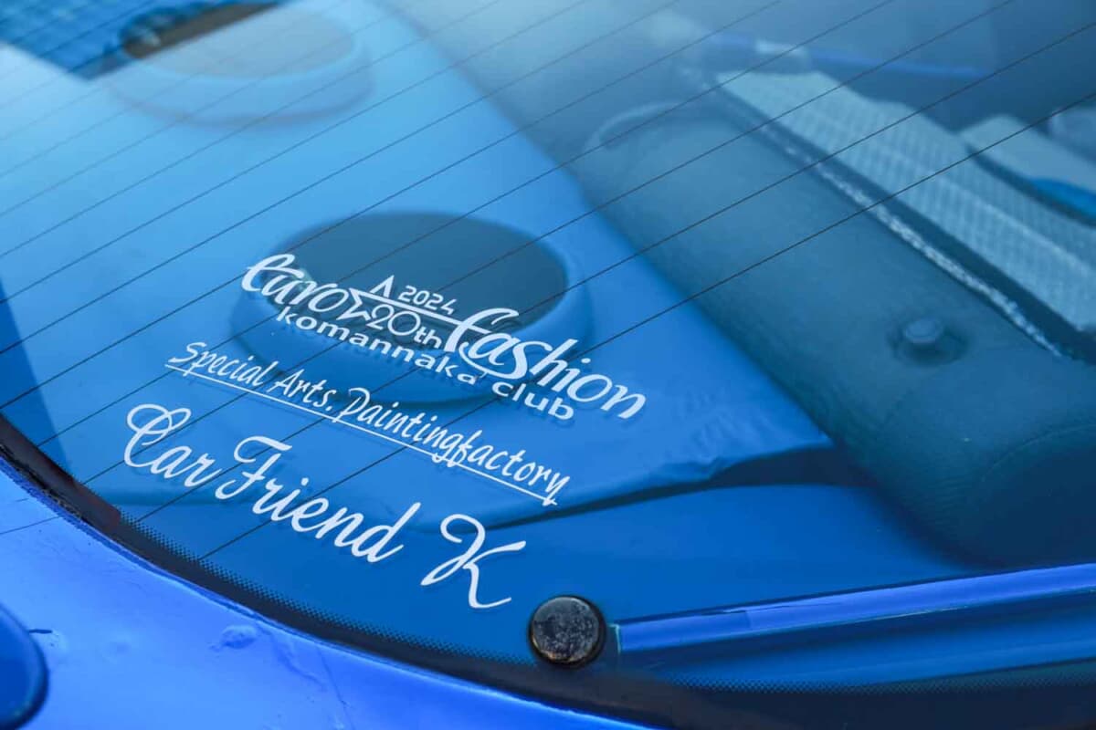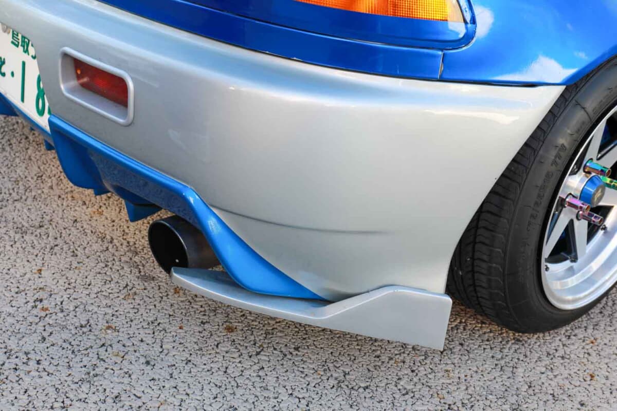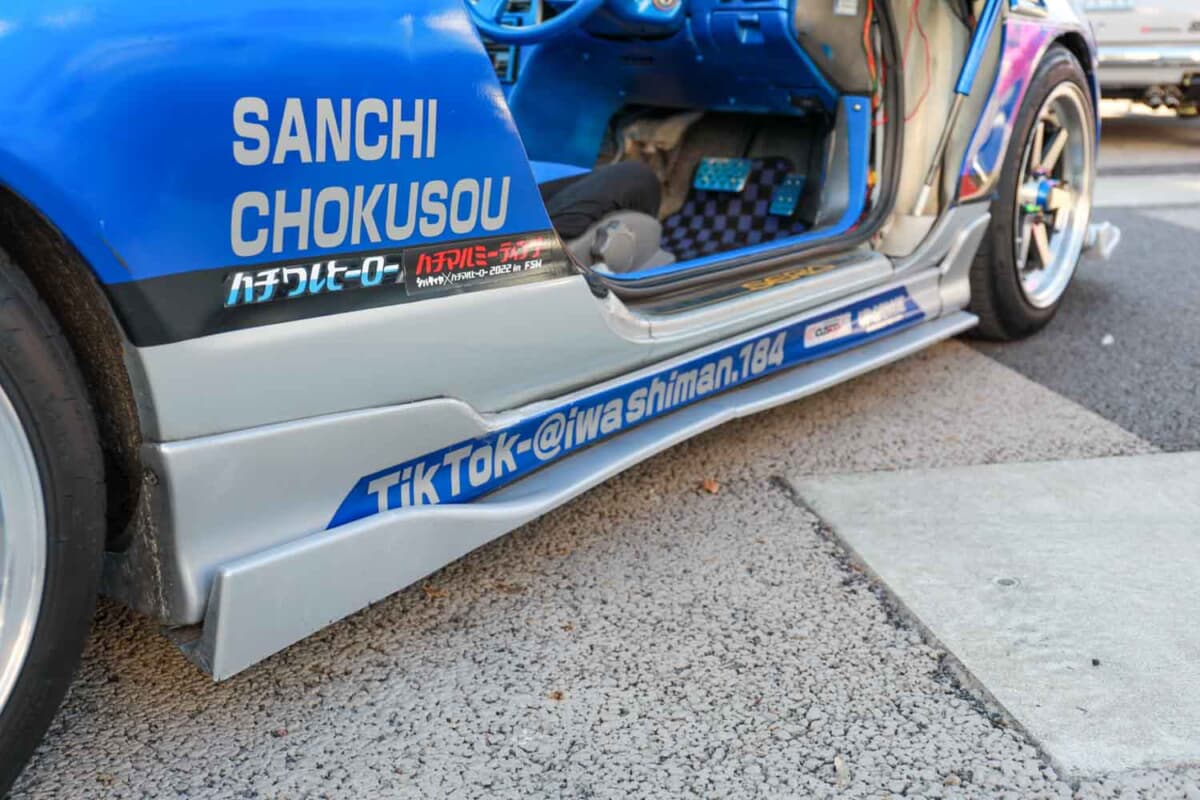 地元の名産であるイワシをイメージしたブルーとシルバーのボディカラーは、スプレー塗料で塗装。そこに自分のイメージを形にしてステッカーでグラフィックを施工した。リアウイングはマツダ「RX-8」用を加工流用するなど、根っからのD.I.Y.精神を炸裂させながら、ご覧のとおりのスタイルを完成させた。