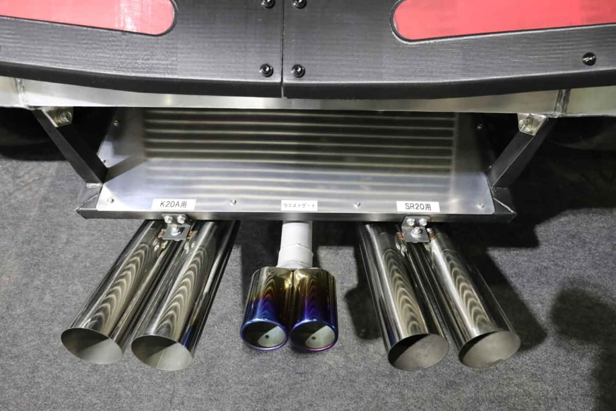 • トヨタ セラ:センターから突き出すマフラーは3本! 中央がウエストゲート(余剰排気を逃がす弁)用、右がフロントSR20VET用、左がK20A用だ