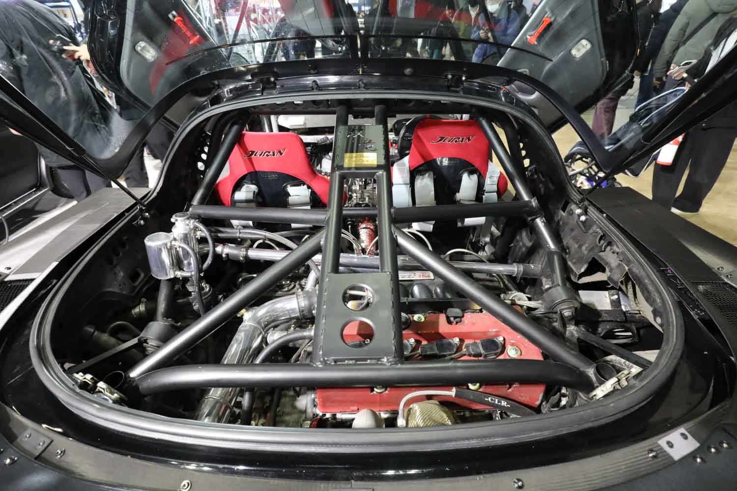 最後になったが、外装にも注目したい。この戦闘的なフォルムは大型3Dプリンターを駆使し、渡辺氏が思い描くスポーツカー像を形にした姿だ。かつてのセラの面影はガルウイングのキャビンまわりのみに残し、それ以外は無骨な力強さを表現するパネルで構成。まさに謎のスポーツカー、異色のモンスターマシンとして特別なオーラを放っていた。