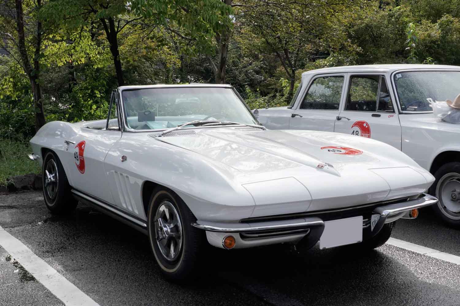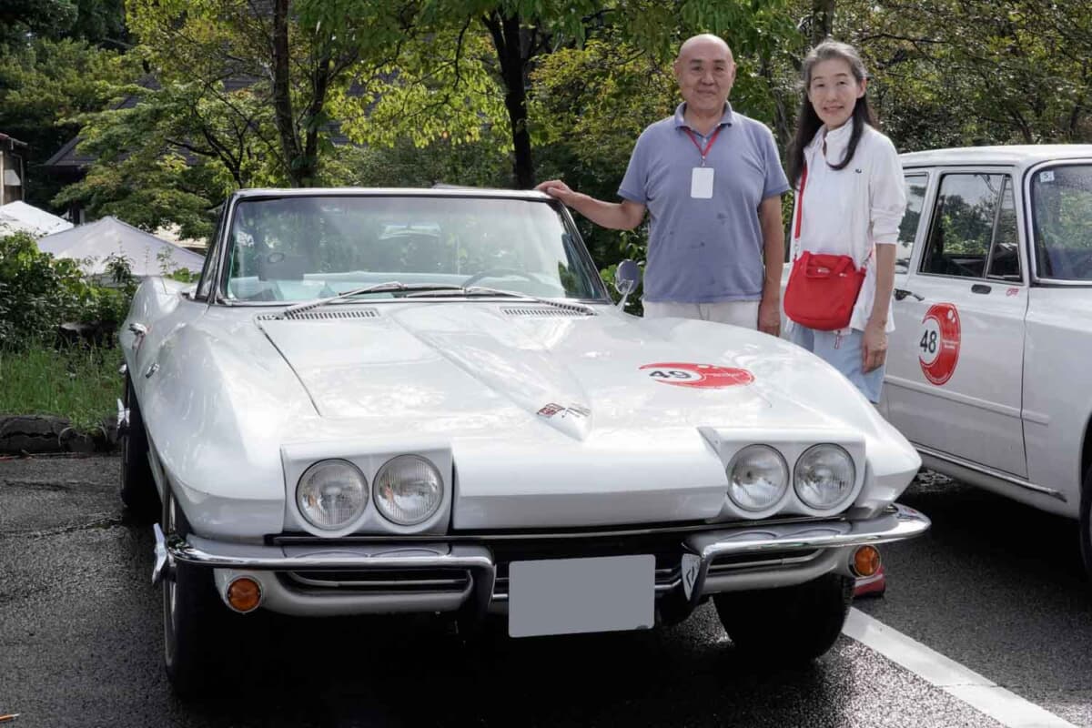 雨が上がり、暖かい日差しを受けて輝く純白のボディを纏った1965年式のシボレー コルベット コンバーチブルで参加していたのは、根本勝さんと濱中庸子さんのペア。C2と呼ばれる第2世代のモデルである。じつは、この愛車コルベットと「スプレンドーレ伊香保」は、根本さんにとって非常に大切な思い出のある組み合わせなのだ。