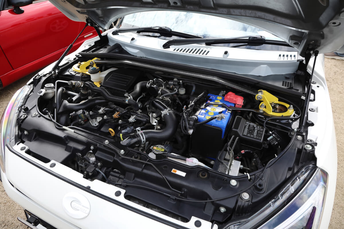 インテリアもD-SPORT製のシフトノブを投入。トランクバー、ロールバー、タワーバーなど補強もフル装備だ。さらにD-SPORT製にコンピュータMAXオリドのスロットルコントローラーでレスポンスもアップさせている。雪道を走ることも考慮してロールバーを備えるなど、実用とスポーツを両立させた仕様が特徴だ。現在はジムカーナやサーキット走行も楽しんでいる。