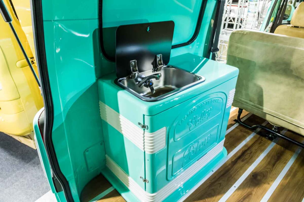 一方、内装はシートカバーでレトロな雰囲気にリフレッシュしたうえで、フロアはウッド張り。しかもカーゴスペースにボディ同色にコーディネートしたシンクを設置している。あとはユーザーの好みで車中泊仕様にしてもいいし、逆に内装をすべて外して荷物を運ぶデリバリーカーにしてもいい。さらに手を入れてフードトラックとして活用するのもいい。いずれにせよ、この素敵なシャレの効いたコマーシャルカーをどうやって活用するかは、ユーザーである皆さん次第というわけだ。