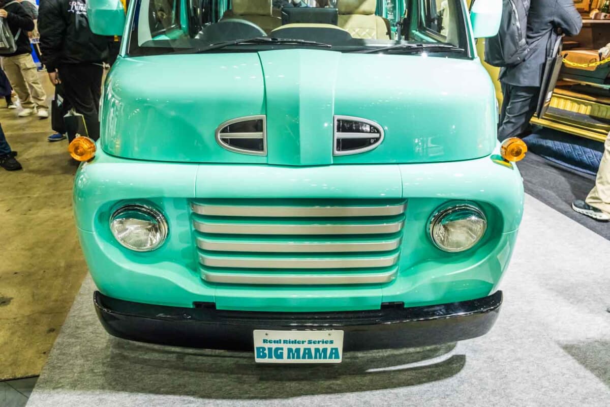 スタッフにお話を伺うと、ベース車両はなんとトヨタのタウンエースとのこと。「ビッグママライダー(注)」と名付けられたこのカスタムは、フロントを1948年〜1952年フォードのCOEトラックをモチーフとしているそうで、COEのずんぐりとしたフロントまわりが見事に再現されている。ベースとなるタウンエースはワンボックスながら短いボンネットを持つセミキャブオーバー構造であることで、モチーフとしたクルマへのスタイリングに模しても無理がないのだろう。