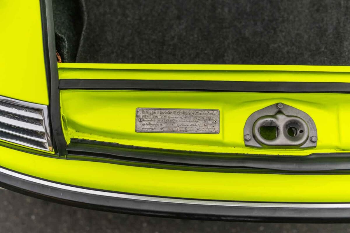この個体は当初、市販向けの「911S-2.4」として製造工程が開始された。わずか1年間のみ生産された、通常燃料給油口がある位置にオイル給油口を備えていた、いわゆる「オイルフラップ」モデルである。1972年6月20日付のオリジナル車両注文書の写しによれば、ポルシェの「スペシャルウィッシュ」カスタマイズプログラムを通じて、実験的な「蛍光イエロー」塗装が指定されていた。また、2.4Lエンジン(エンジンNo.6322388)、「パールコード」仕様のブラックレザレット(ビニールレザー)内装、運転席側ドアミラーが装備されていたようだ。
