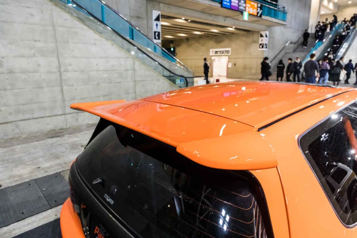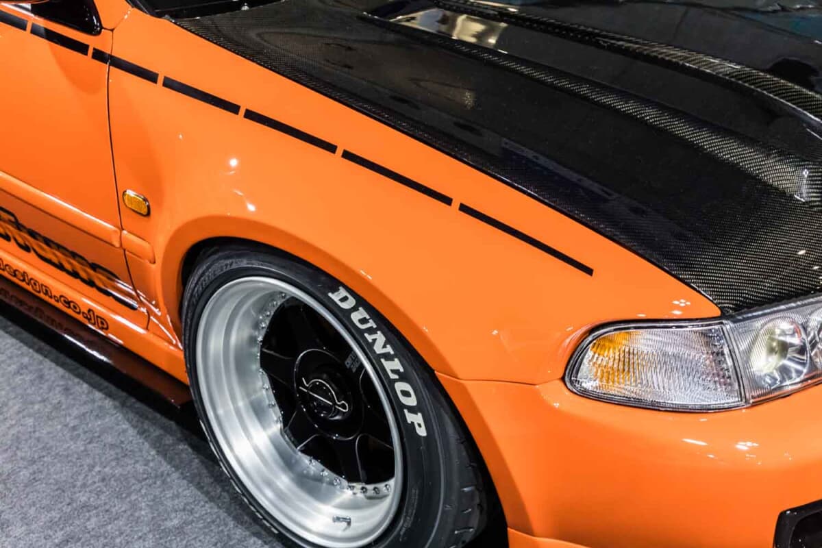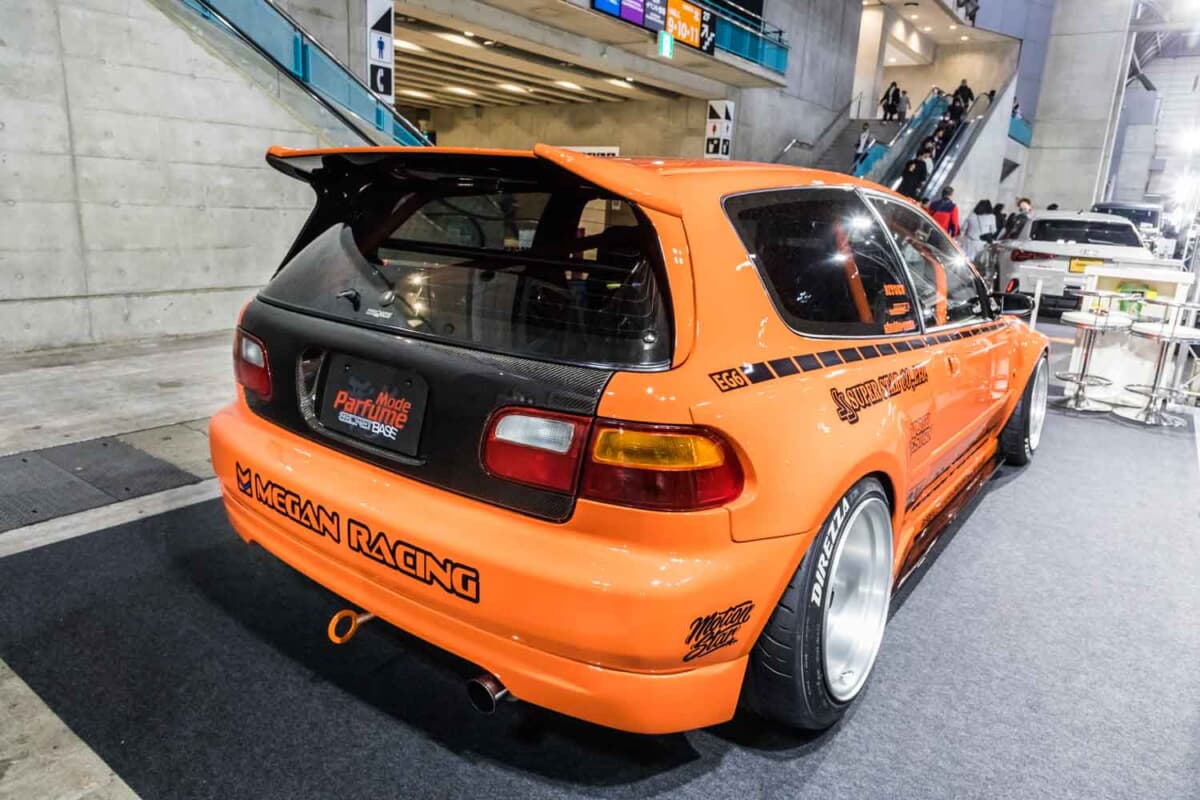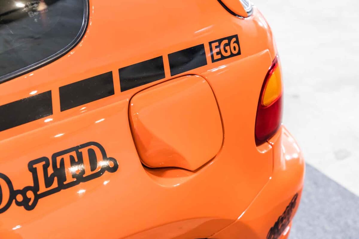 2026年のオートサロン会場でも、ひときわ目立っていたのが鮮やかなオレンジにペイントされたEGシビックです。エアサス(空気の圧力で車高を上下させる装置)で地面に設置するような車両が多いなか、あえて低すぎない車高を維持したその姿は、会場内で不思議なオーラを放っていました。迫力のスタイルの理由は、新たにデビューしたワイドボディキットにあります。細部までこだわり抜かれた渾身のボディを紹介します。