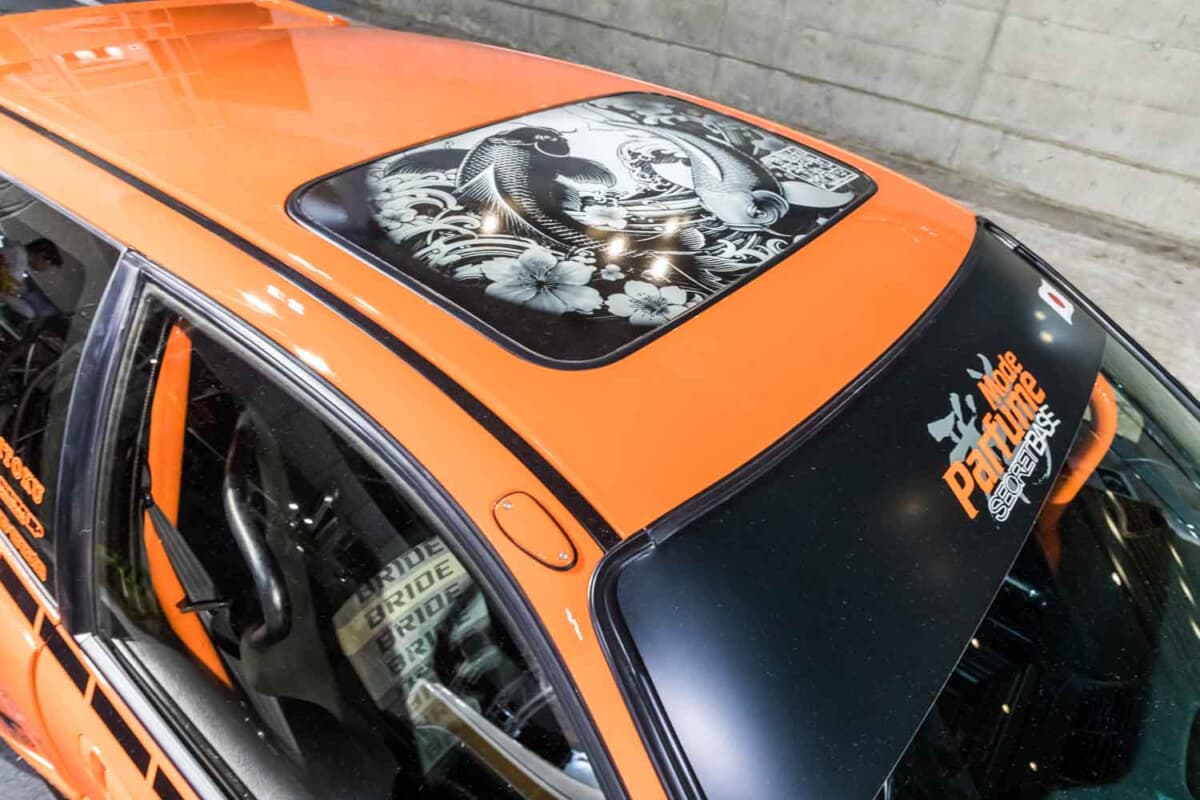 車高も低すぎないものの、トラックスタンス(サーキット走行車両のような佇まい)よりは若干下げた絶妙なバランスとなっている。ボディカラーをオレンジ、レタリングやストロボストライプ(縞模様のグラフィック)をブラックに限定した、渋い仕上がりとなっているのが特徴だ。