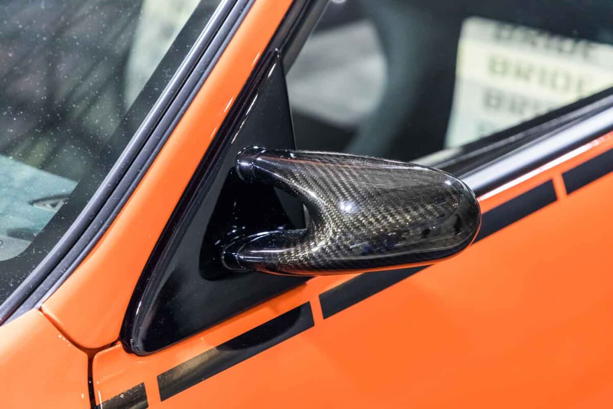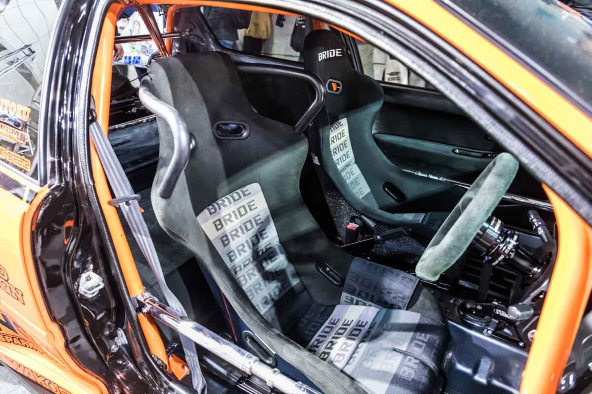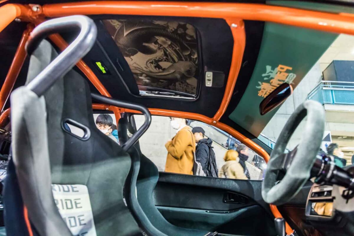 車内を見てみると、ダッシュボードやドアパネルはあえて残したうえで、アルカンタラで張り替え、シートはBRIDEのバケットシートを2脚設置。そのうえで、リアシート部分やラゲッジスペースもすべてアルカンタラを張ることで、軽量化のためになんでも外してしまうレースカーとは一線を画した、ショーカーとしての側面を強調。機能美とディテールアップされたインテリアが共存する、魅力的な1台となっているのだ。