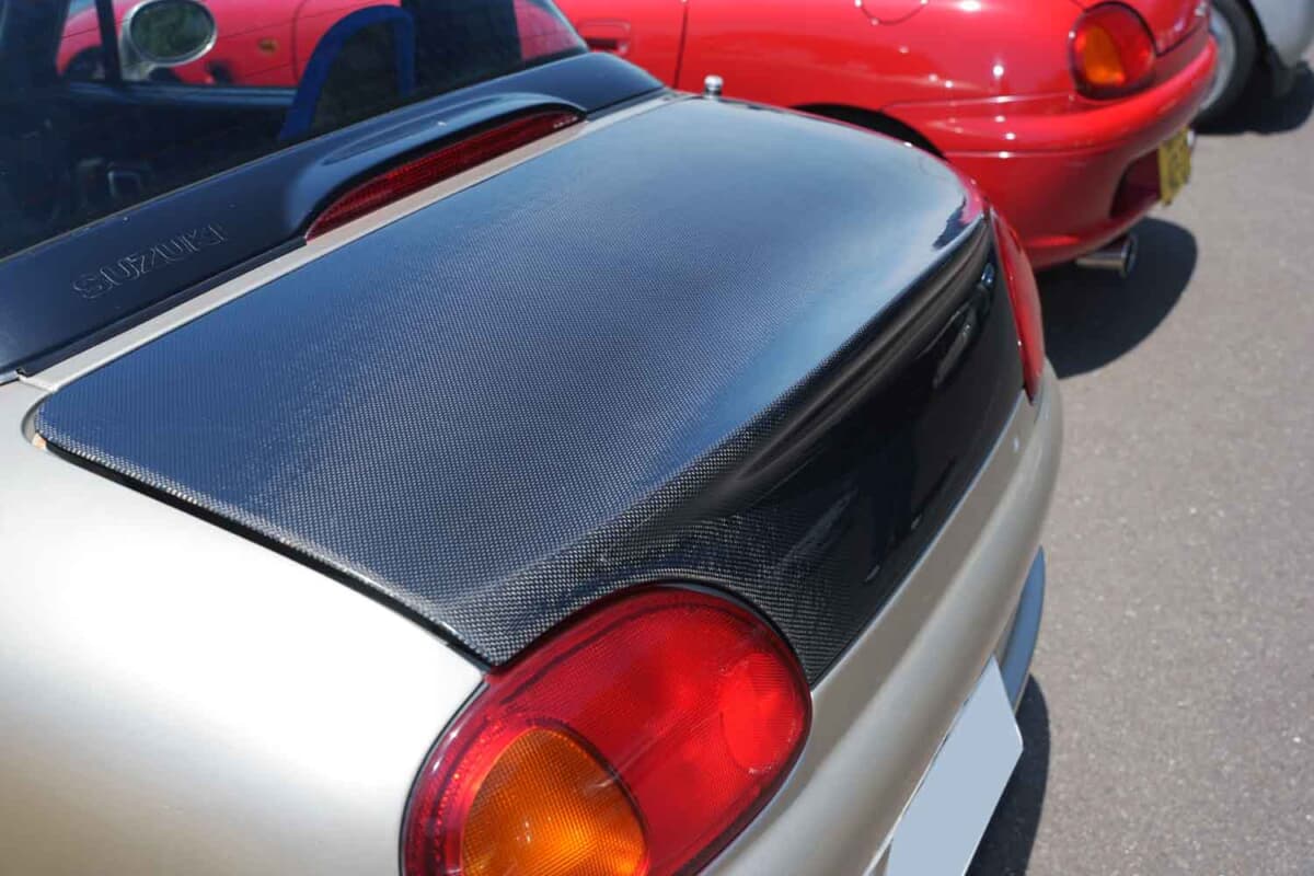 • スズキ カプチーノ:トヨシマクラフトのカーボン製トランクはさり気ないダックテール形状を採用。定番のリアスポイラーではなくあえて一体型を選んだ