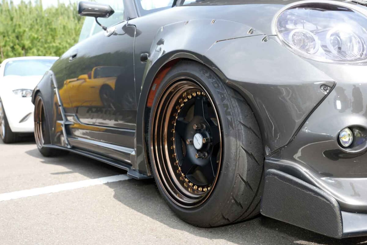 • ダイハツ コペン:ホイールはワークのマイスターCR01で、サイズは前後とも8J×16+3をチョイス。組み合わせるのはシバタイヤのR23で205/45-16だ