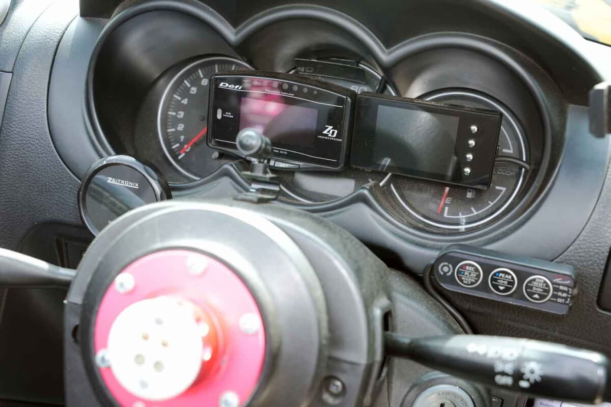 • ダイハツ コペン:追加メーターは走行中に数値が読み取りやすいデジタル式だ。できるだけ視線を動かさずに済むよう、取り付ける位置にもこだわっている