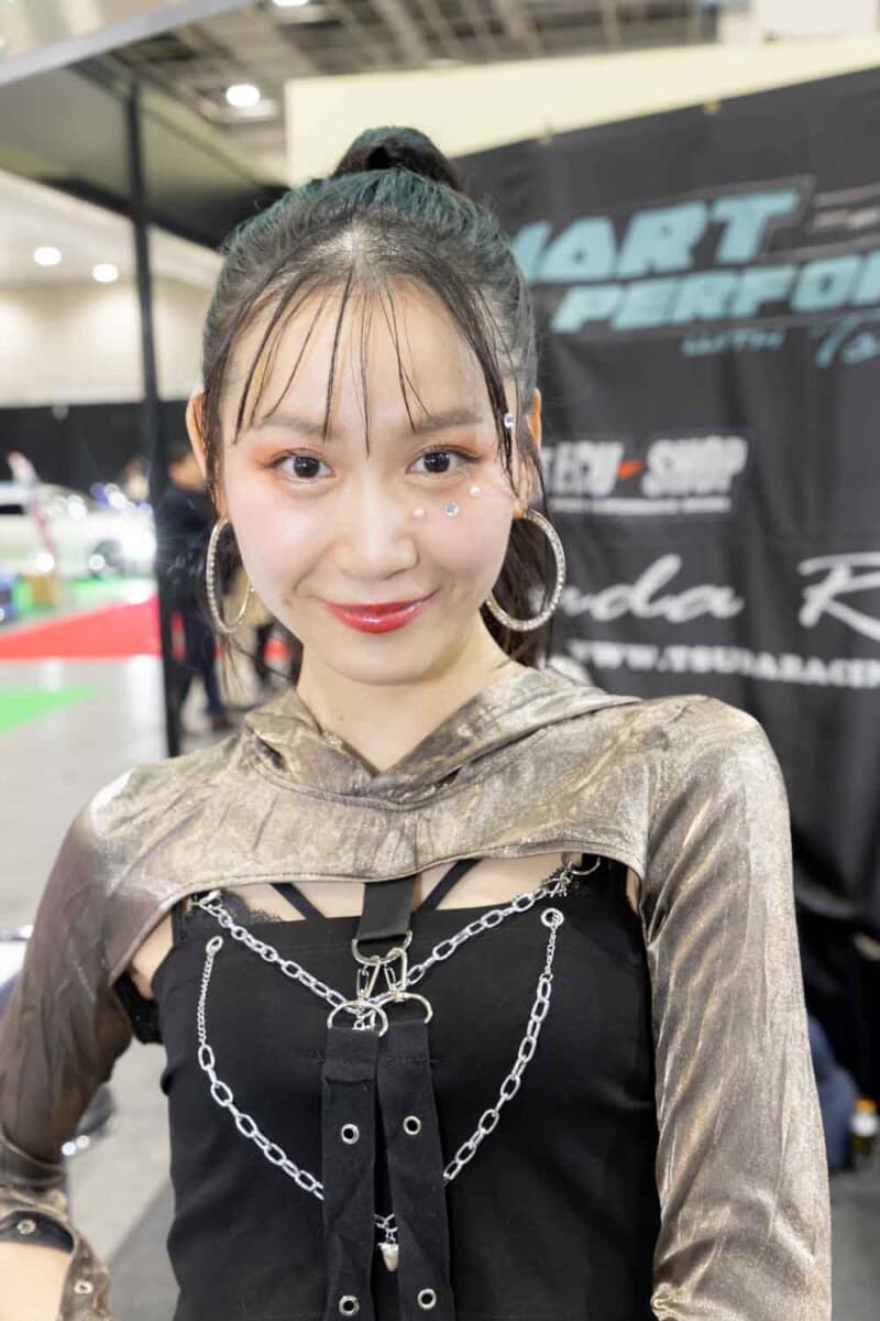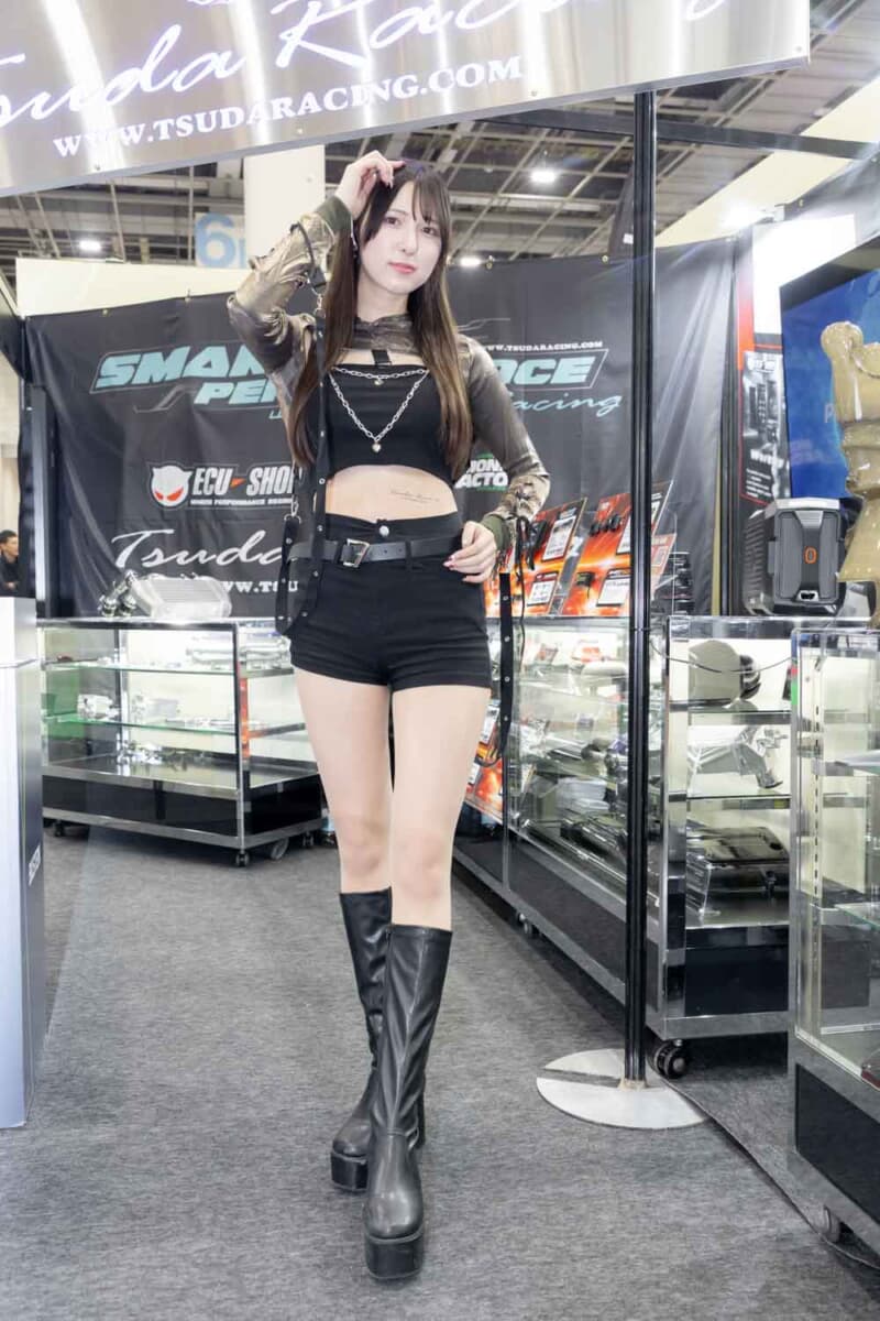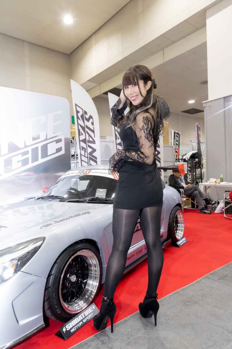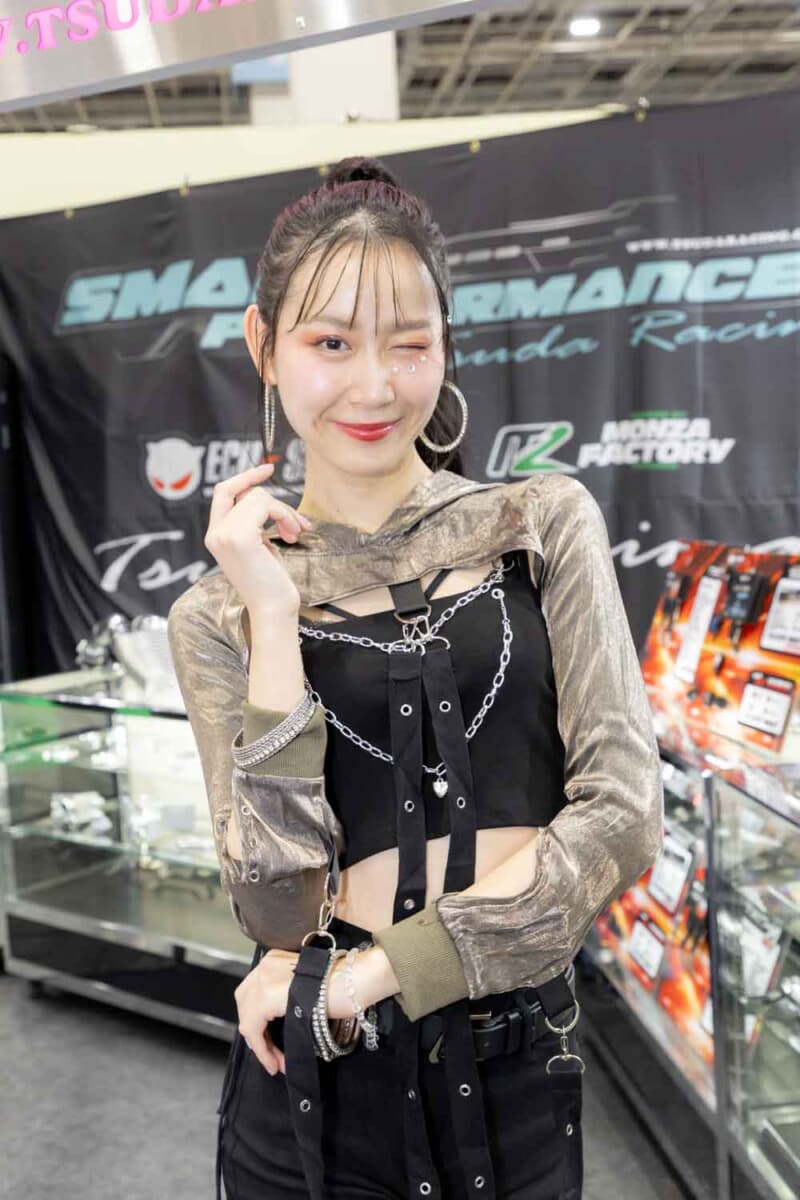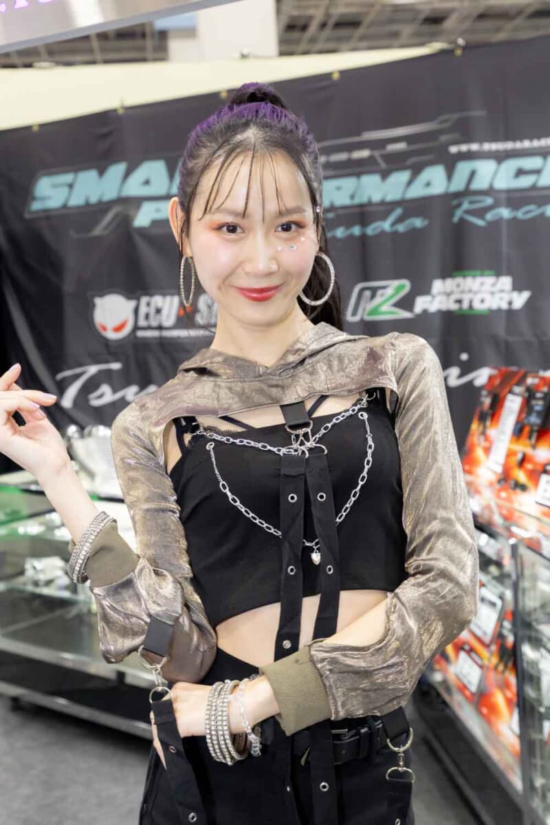 個性あふれる車両が並ぶなかで来場者の視線を集めているのは、ブースを彩るキャンギャルおよびコンパニオンの存在である。各メーカーやパーツサプライヤーのブースでは、ブランドイメージを体現する彼女たちが来場者を迎え、展示車両の横で華やかな雰囲気を演出している。