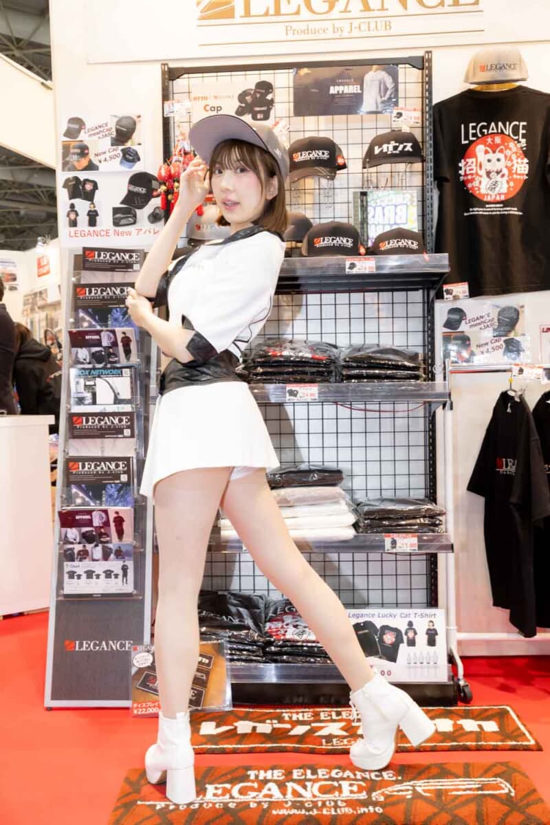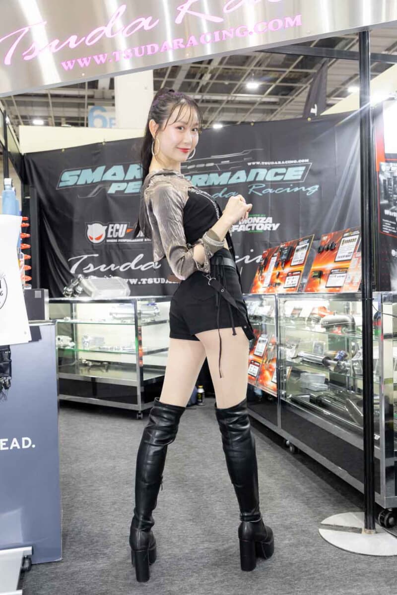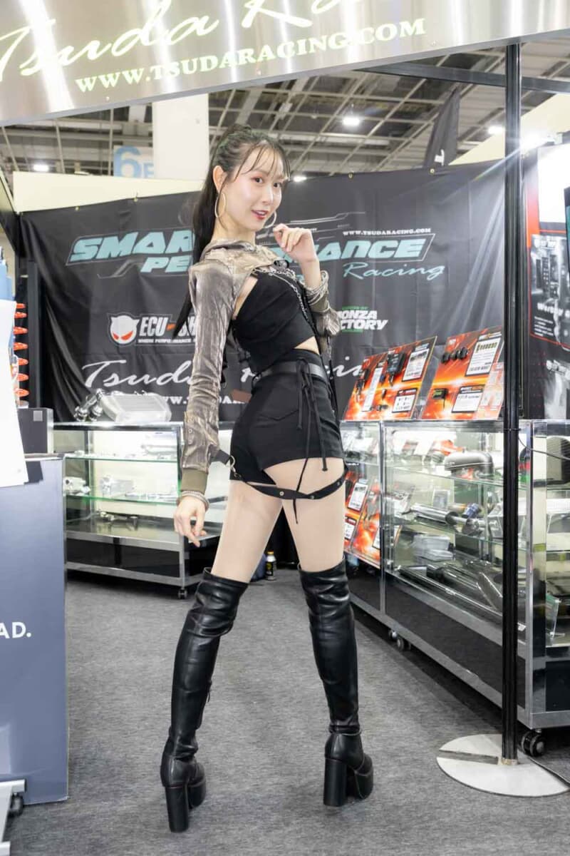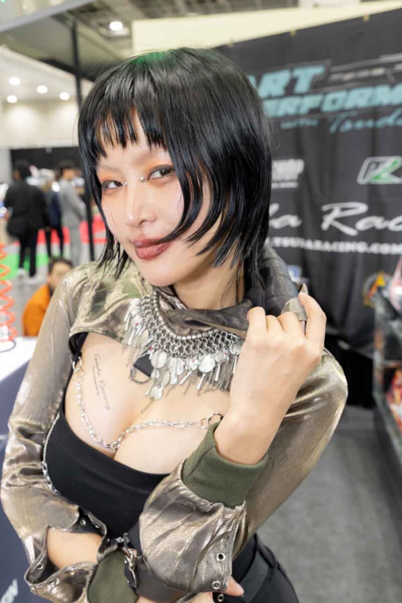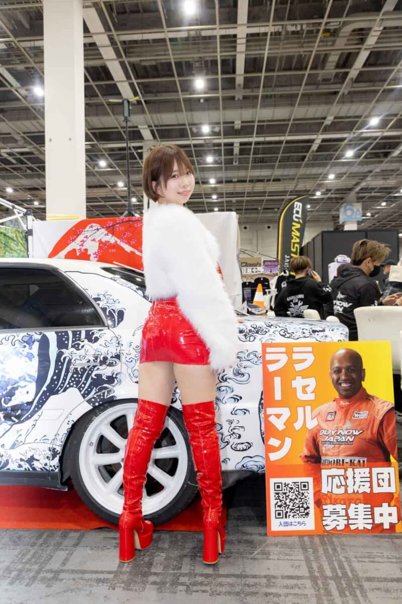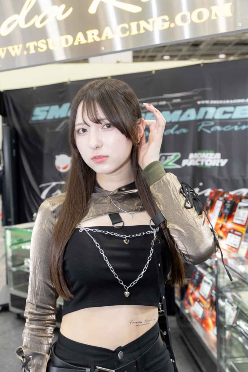 個性あふれる車両が並ぶなかで来場者の視線を集めているのは、ブースを彩るキャンギャルおよびコンパニオンの存在である。各メーカーやパーツサプライヤーのブースでは、ブランドイメージを体現する彼女たちが来場者を迎え、展示車両の横で華やかな雰囲気を演出している。