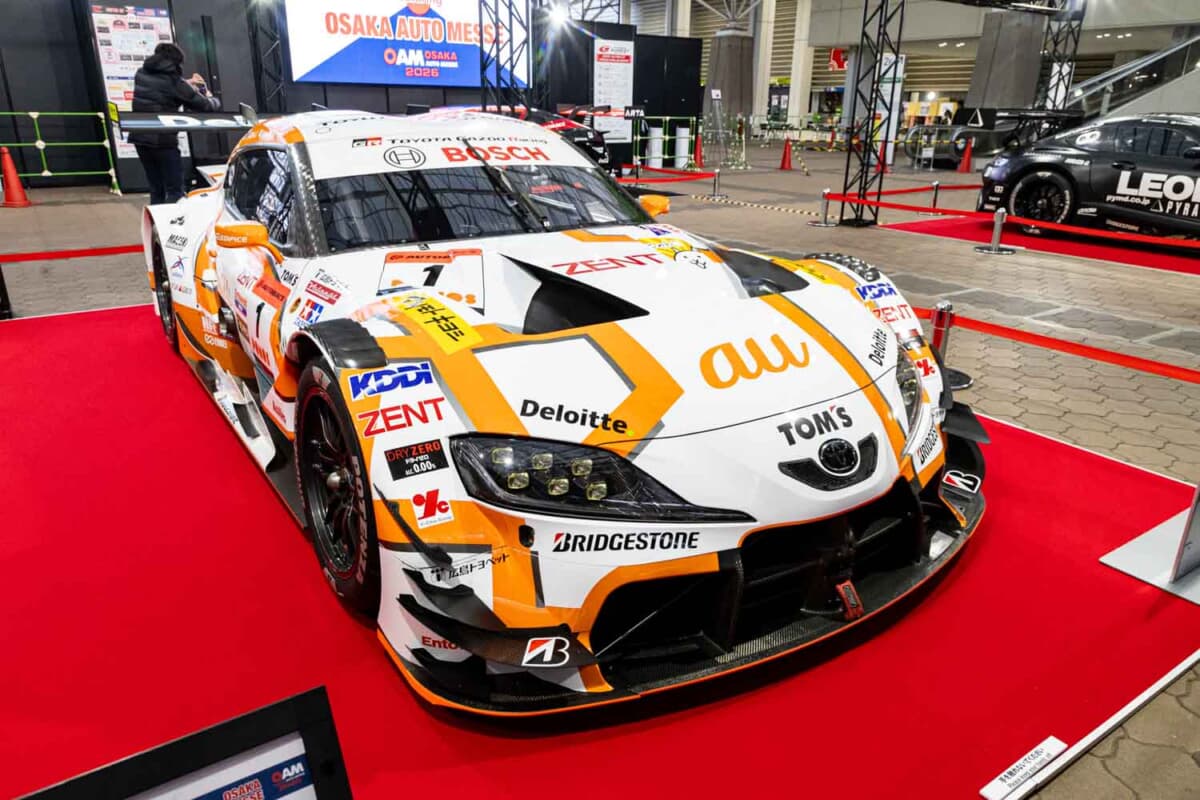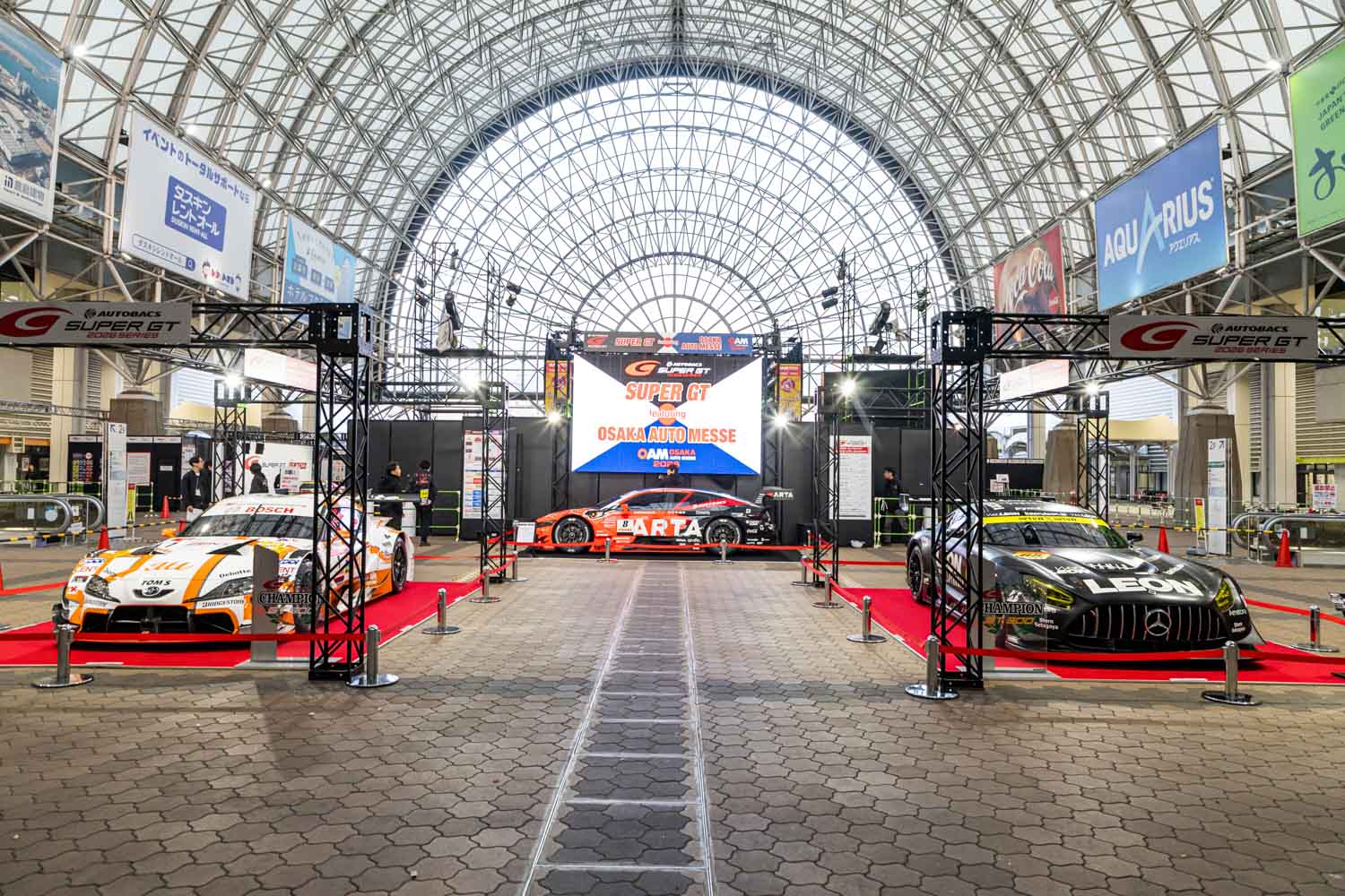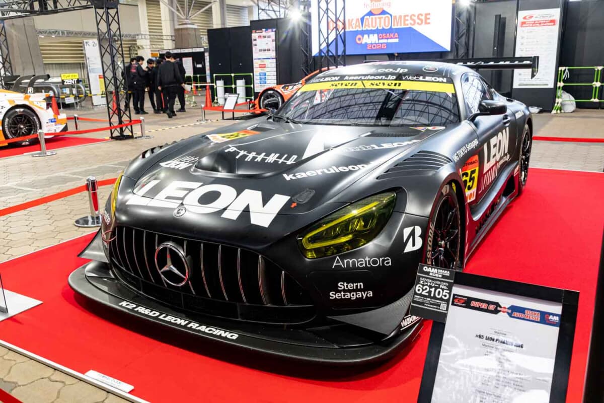 見どころがたくさんあって目移りするが、まずは注目したいのは、インテックス大阪の西ゲートから入場してすぐのインテックスプラザに3台の展示車両がある。2026年、ここで来場者を出迎えてくれるのは、2025シリーズGT500/GT300クラスのチャンピオンマシン「#1 au TOM’S GR Supra」と「#65 LEON PYRAMID AMG」だ。そしてホンダ陣営からは、「#8 ARTA MUGEN CIVIC TYPE R-GT」が登場した。