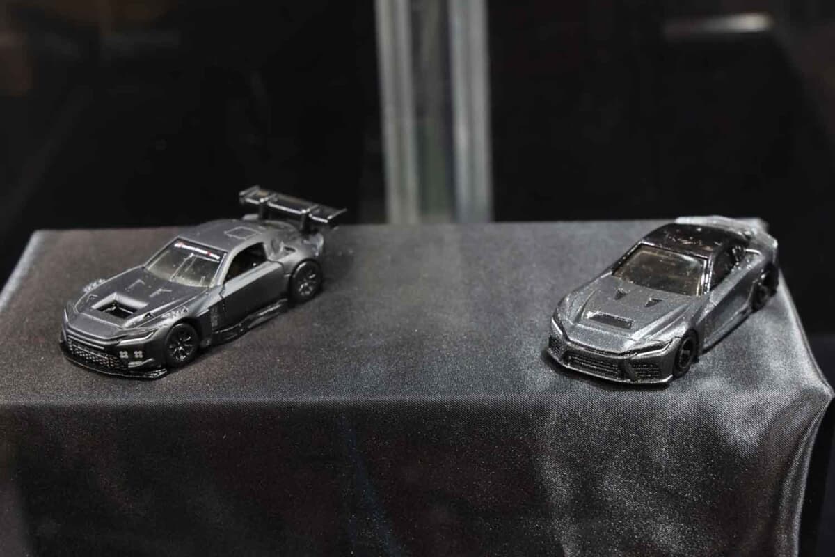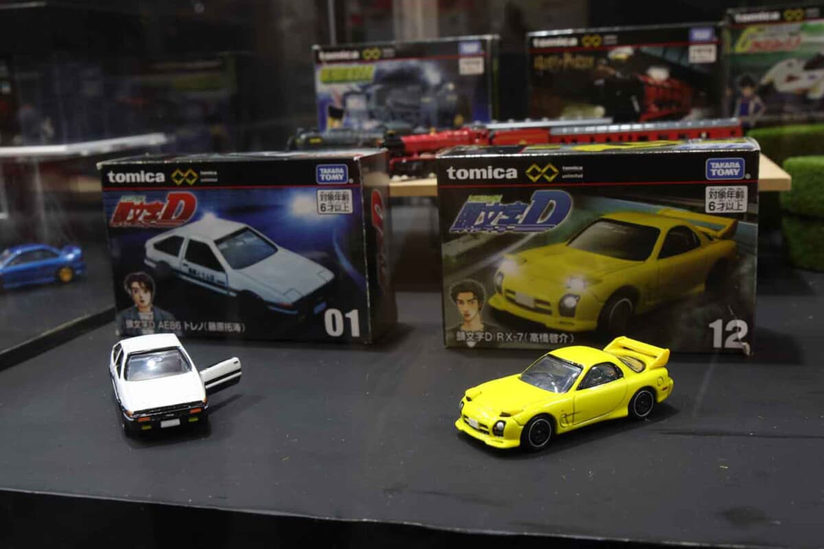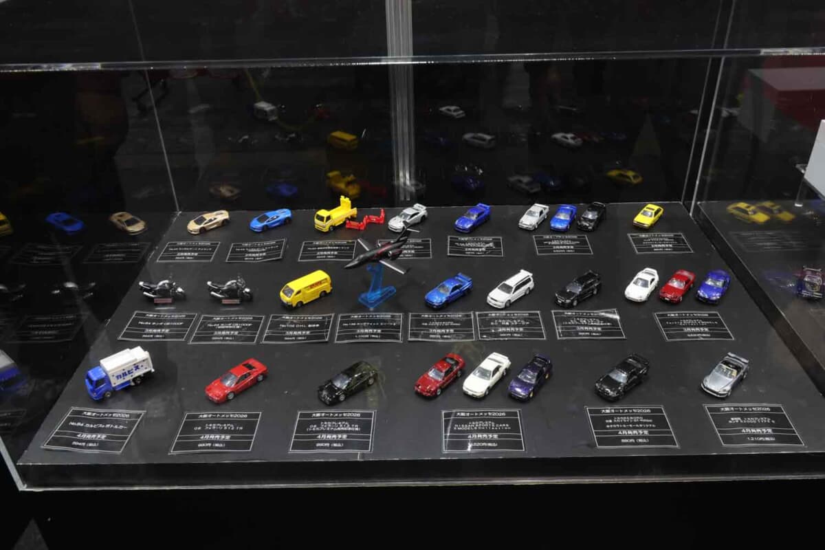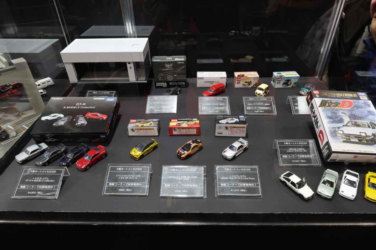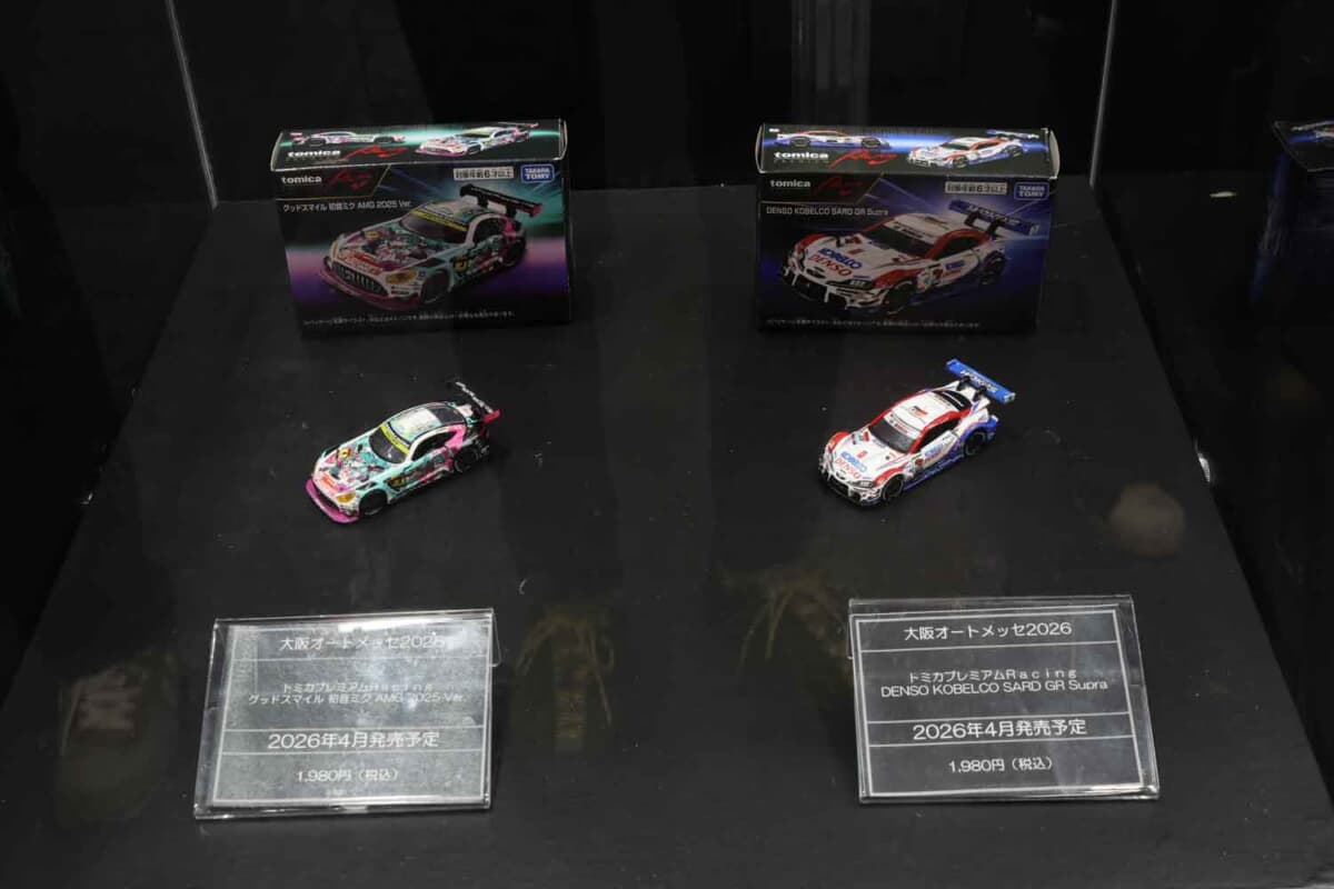 今回の大阪オートメッセでは、創刊30周年を迎えたカー漫画の金字塔「頭文字(イニシャル)D」とのコラボ商品と、2026年の上半期に販売が予定される新商品を中心にブースを展開。なかでも注目を集めたのが、新ブランド「トミカプレミアムレーシング」シリーズです。2025年のスーパーGTレースを戦った「DENSO KOBELCO SARD GR SUPRA」と「グッドスマイル初音ミクAMG 2025Ver.」、そしてトヨタの次期スーパースポーツである「GR GT3(GR GTは通常のトミカプレミアムで発売)」の3種類が披露され、多くのファンが食い入るように眺め、写真に収めていました。