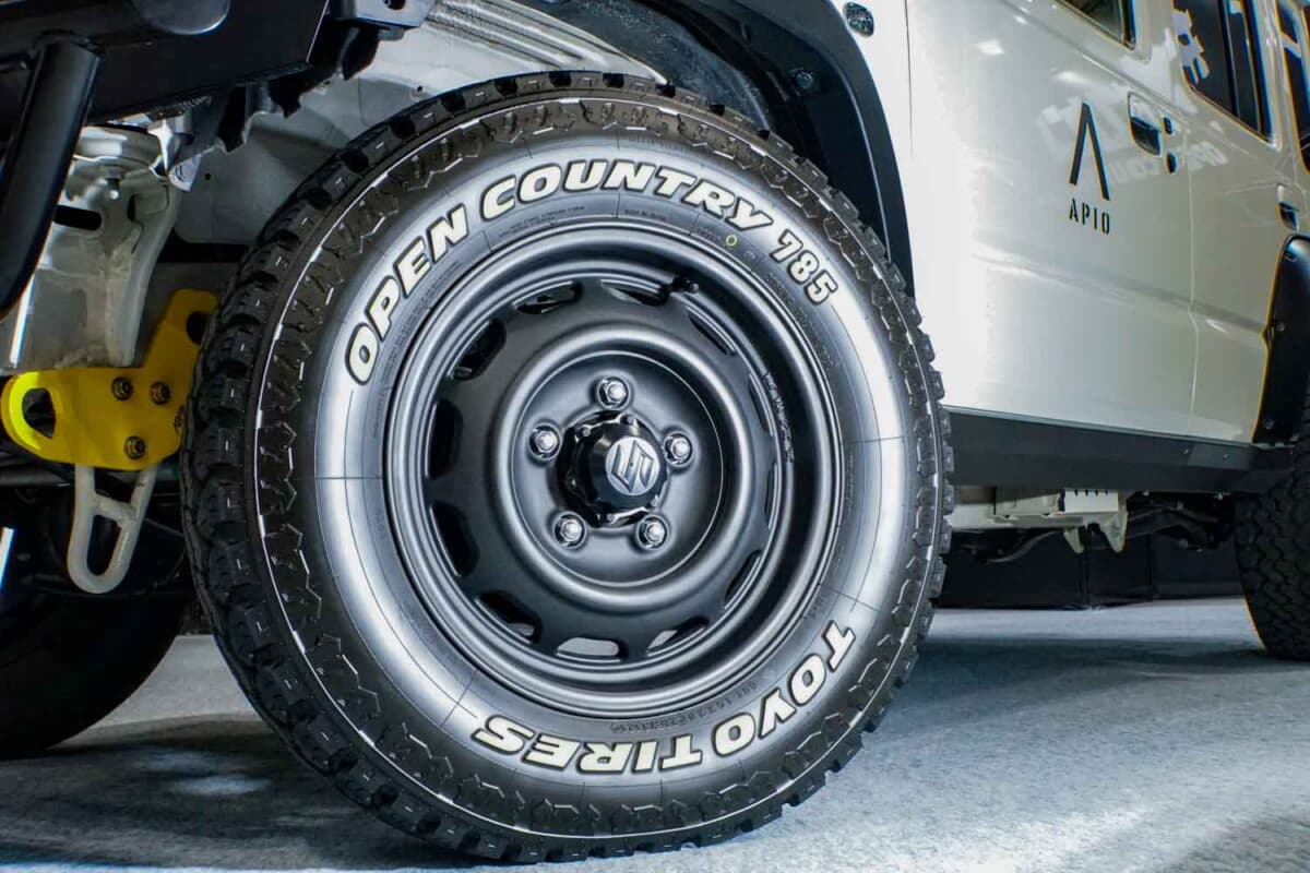 最後に紹介したいのが、APIOのスズキ ジムニー・ノマドに装着されたオープンカントリー 785(205R16C 110/108N)。1983年当時のパターンデザインを復刻した、マッド&スノー(M+S)タイヤである。マッドやウェットの路面で確かなトラクションを発揮するのはもちろん、サイドウォールは2種類のデザインを用意。ブラックレター側には発売当時のロゴを再現し、レトロな雰囲気を演出。一方、アイボリーホワイトレター側は現代的で洗練された印象に仕上げられている。対応サイズは16インチのみという潔さも、このモデルらしい。