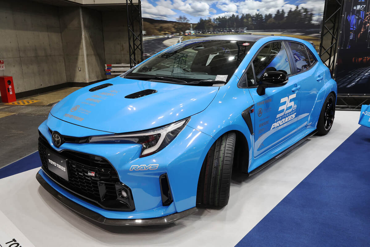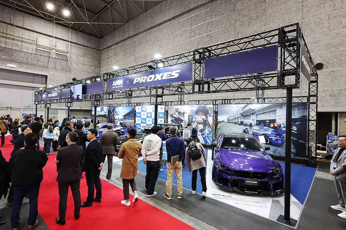 ブランドのイメージカラーの青を基調に、モータースポーツイメージを全面に押し出したAMW×プロクセスブースには、プロクセスを履き、リアルに戦い、走り、語れる4台の車両が並ぶ。欧州車はBMW M2 CS、国産勢は日産R35型GT-Rのチューニングカー、さらに今季からニュルブルクリンク耐久シリーズ(NLS)のSP9クラスに参戦するメルセデスAMG GT3。そして、現在のストリートシーンにおける代表格であるトヨタGRカローラが加わる。