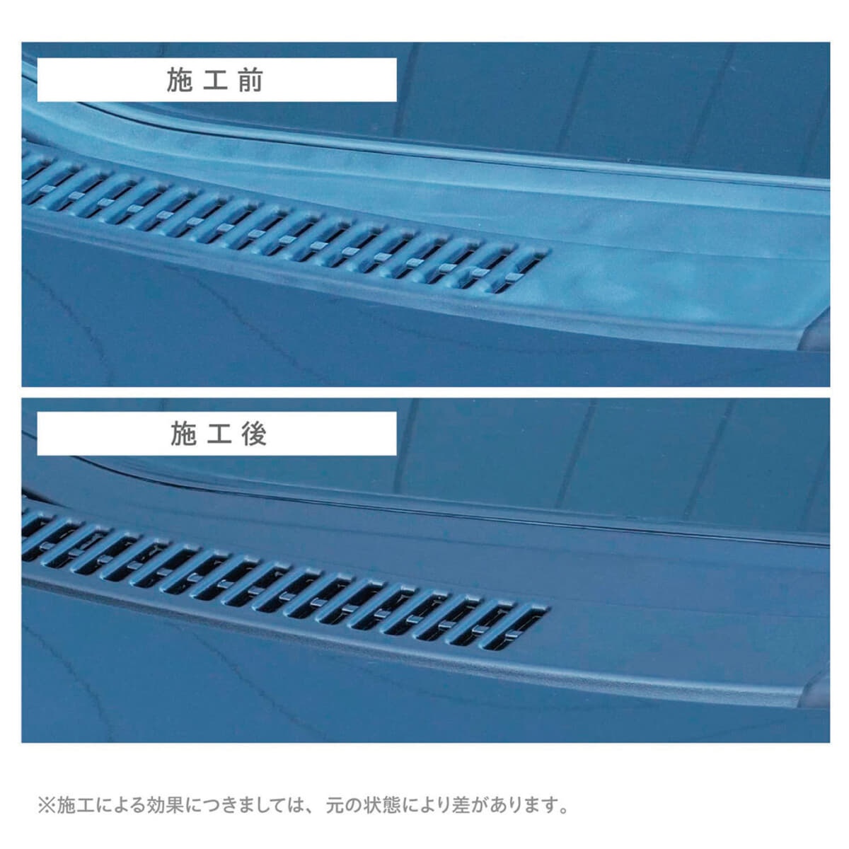 カーシャンプーを使って樹脂部分の汚れを除去した後、適量のプロテクトコートをスプレーしてすぐにマイクロファイバークロスで拭き伸ばす。樹脂以外に液剤が付いていないか確認すること。コーティングを定着させるために24時間は雨や夜露に触れないようにする。