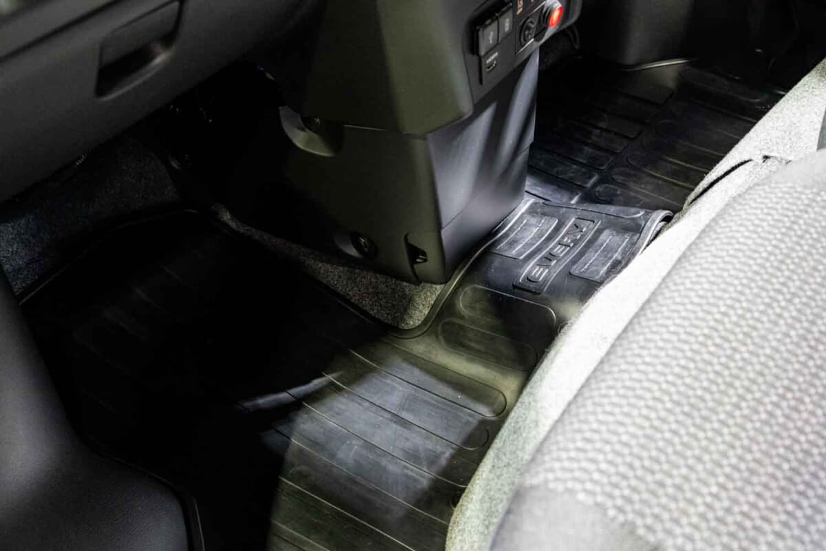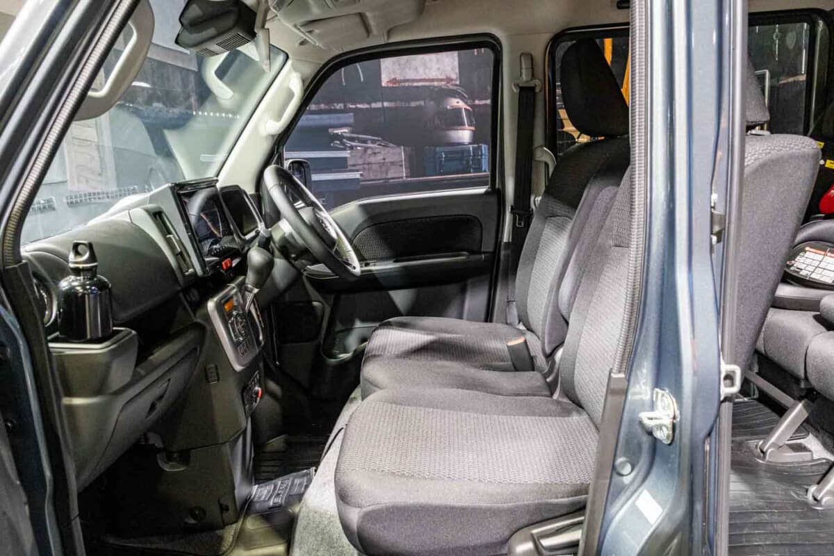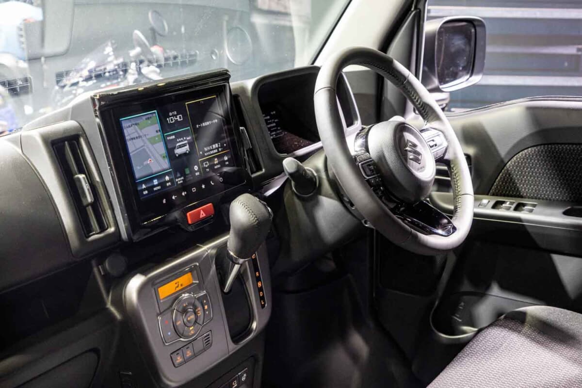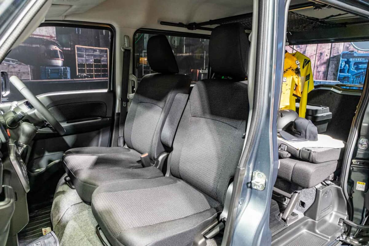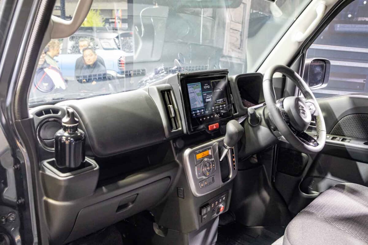 機能パーツのハイライトは、ジムニーシエラ用キャリアをベースに、エブリイ専用サイズで開発された特注のフラットルーフラックの装着です。既存オーナーから最も熱い視線を浴びていたのがインテリア。通常エブリイワゴンはベージュ基調の明るい内装色ですが、本モデルでは精悍なブラック内装に刷新されていました。