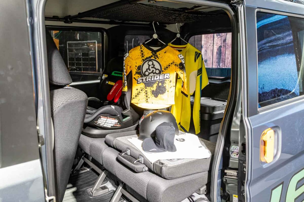 会場に展示された車両には実際に後席にチャイルドシート、荷室にはストライダーのスペアパーツや工具がぎっしりと積み込まれていました。これだけのギアを飲み込みつつ家族4人が快適に移動できるのは、軽バンの王者・エブリイワゴンならではの圧倒的な積載パッケージがあってこそだ。