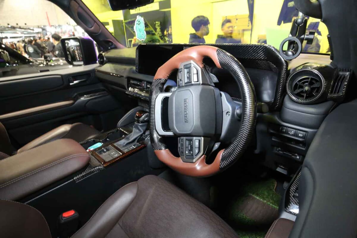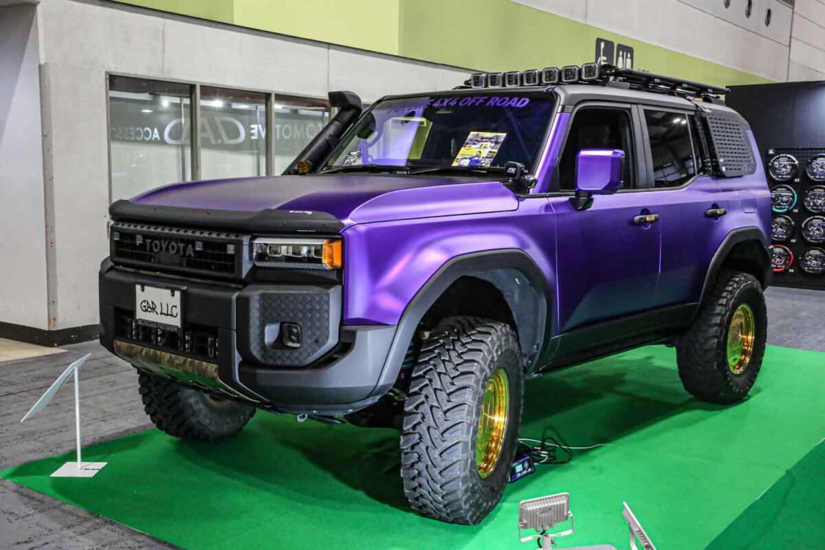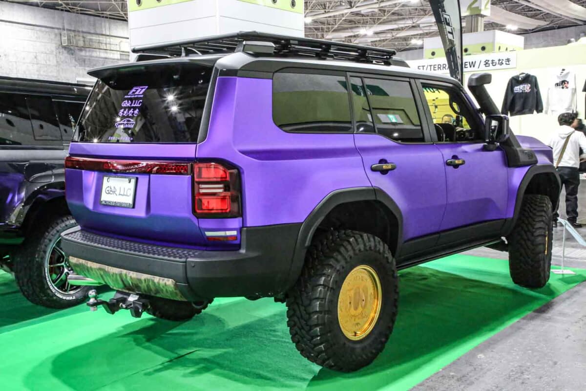 GBRはランクルのカスタムを積極的に展開していて、コーティングやカーシャンプーも取り扱う。展示したランクル250は、FTフォグプロテクターやFTグリルマーカー、FT一文字テールランプ、純正を加工したリアルカーボンインテリアなどスタイリッシュなアイテムを多数装着。高級サスペンションとして名高いドビンソンの3WAYで大胆なリフトアップも施し、マットパープルでボディをフルラッピングするなど感度の高いカスタムが投入されている。