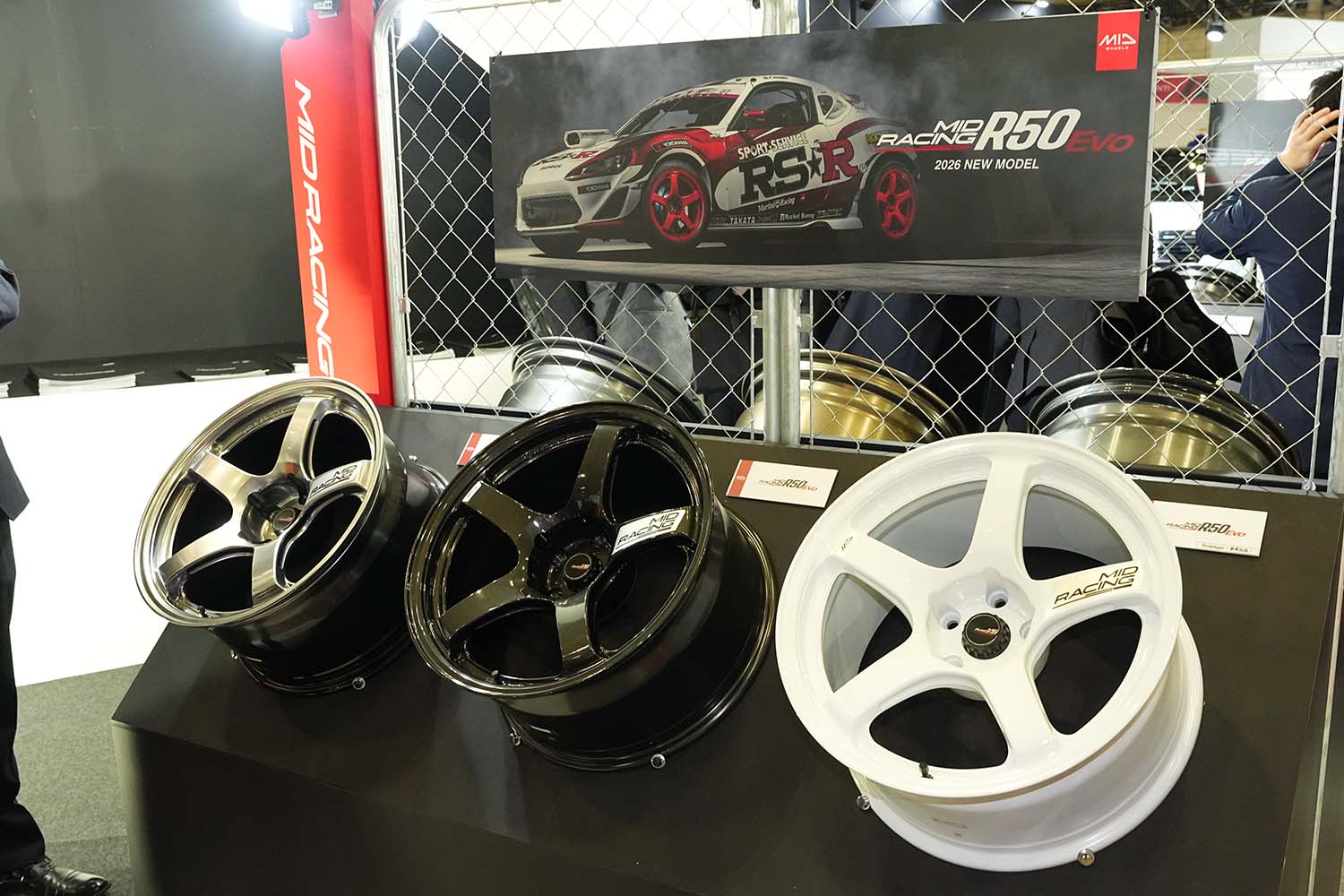 東京オートサロン2026の会場では、R06のホワイトカラーだけでなく、ふたつの新作ホイールも発表。R50EVOは5本スポーク、R10EVOは10本スポークを採用したデザインとなっている。どちらも剛性と軽さにこだわったスポーツホイールだ。