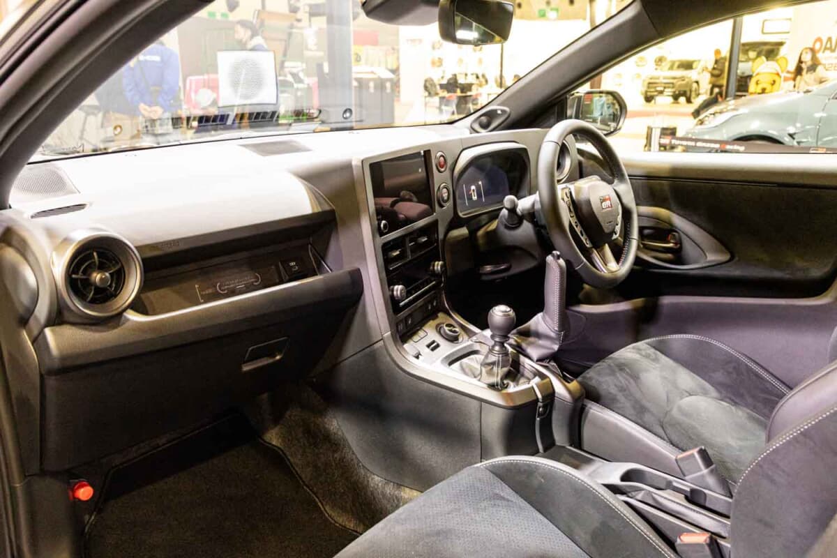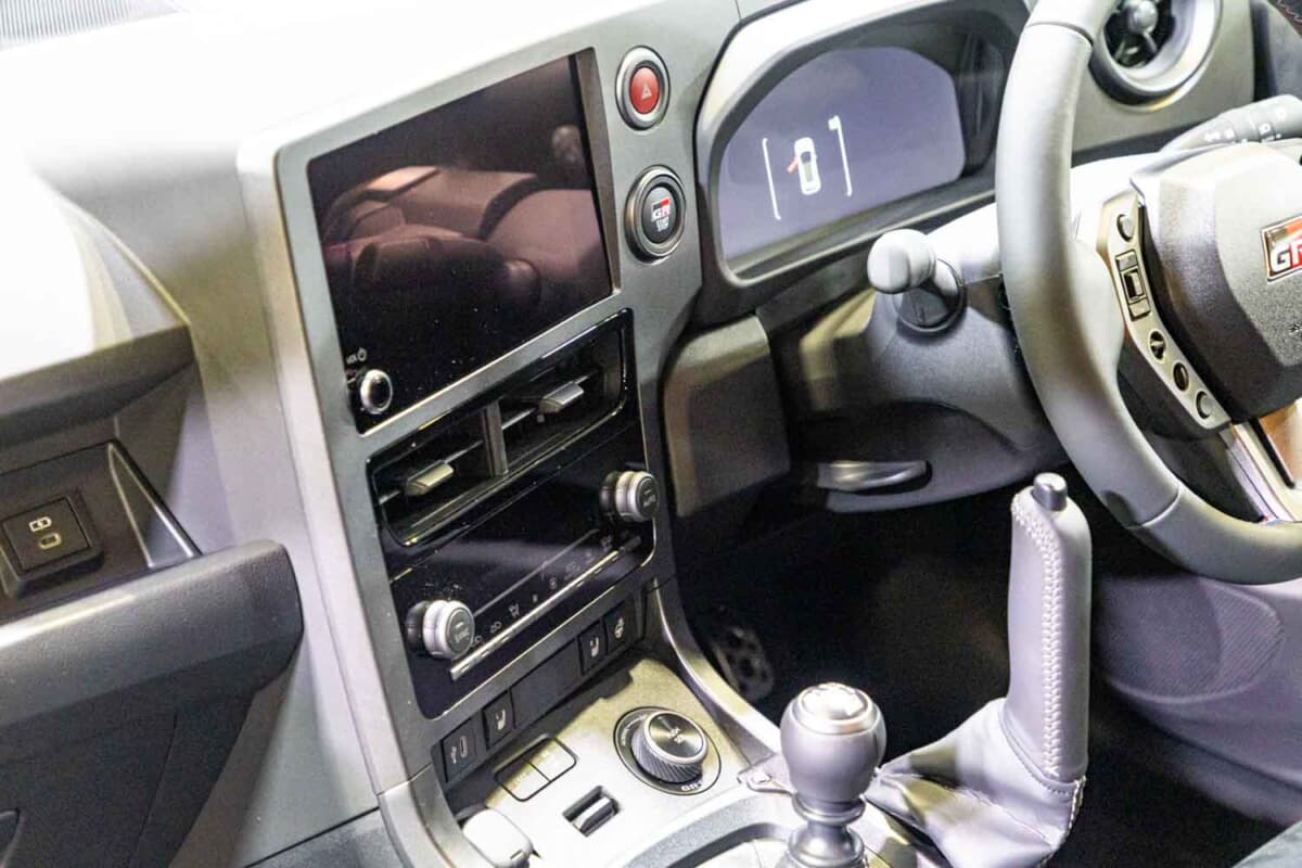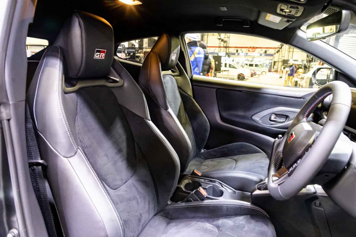 内装では、豪快かつ華麗なサイドターンには欠かせない「縦引きタイプ」のサイドブレーキが目を引く。こちらはグレーステッチ付き革巻きレバー&カバーの凝った作りだ。GR専用ステアリングも、トリコロールステッチに変更されている。