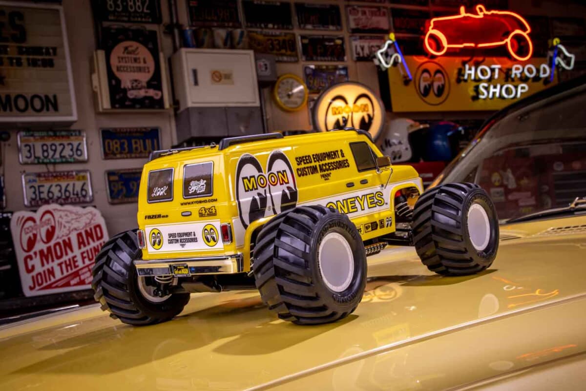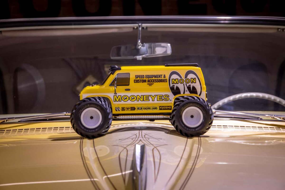 しかし、今回紹介するのは手のひらサイズのミニカーではない。日本の本格ホビーメーカーである京商が放つ、1/10スケールのRC(ラジオコントロール)カー「マッドバン with MOONEYES」というモデルである。ラジコンといえば「走らせて楽しむもの」というイメージが強いが、こちらの新商品はじつに趣がある。というのも、走行性能はいったん脇に置き、クルマ乗りのライフスタイルを彩る「精密な可動式ダイキャストモデル」のような、走るインテリアとしての価値を提案しているのだ。